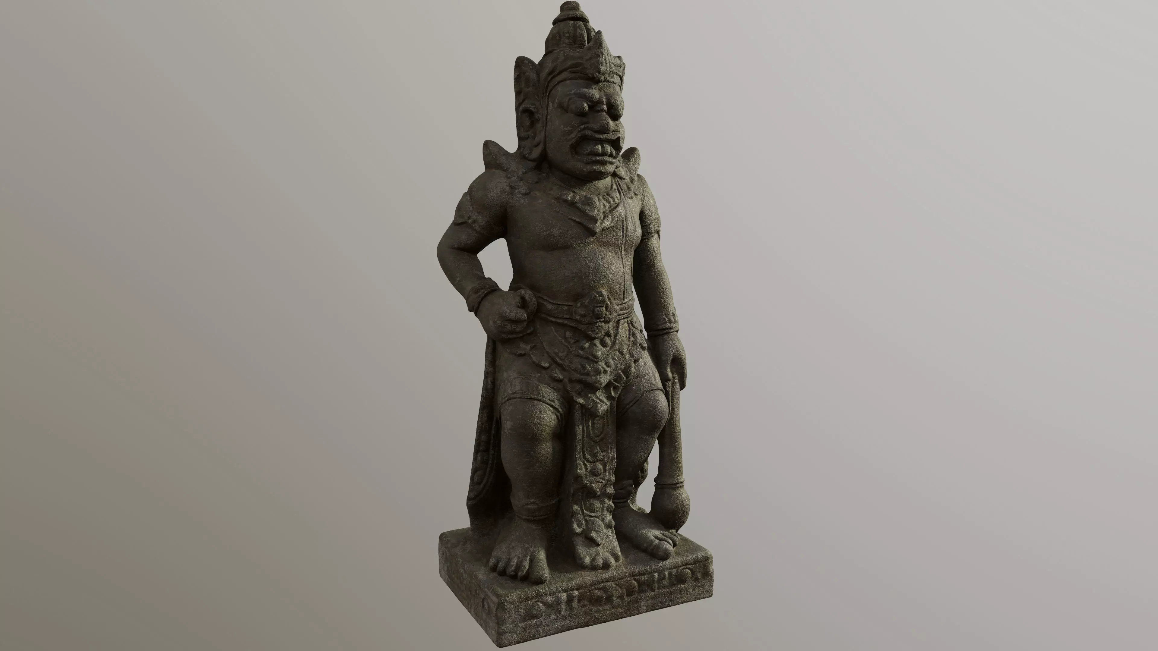 Guardian Stone Statue – High-Detail meshA 3D asset of a stone statue depicting a fierce guardian figure, commonly seen in Southeast Asian temple complexes. The sculpture features exaggerated facial expressions, large fangs, ornate jewelry, and warrior attire, all carved with strong stylistic character. The figure stands firmly on a decorated pedestal, gripping a ceremonial club and wearing layered drapery with intricate patterns.The stone surface is captured with exceptional realism, showing natural erosion, chisel marks, and aged patina—perfect for enhancing temple environments, ancient ruins, fantasy realms, action-adventure games, VR experiences, and cinematic worldbuilding.Optimized for PBR workflows and ready for use in Unreal Engine, Unity, Blender, and Maya.