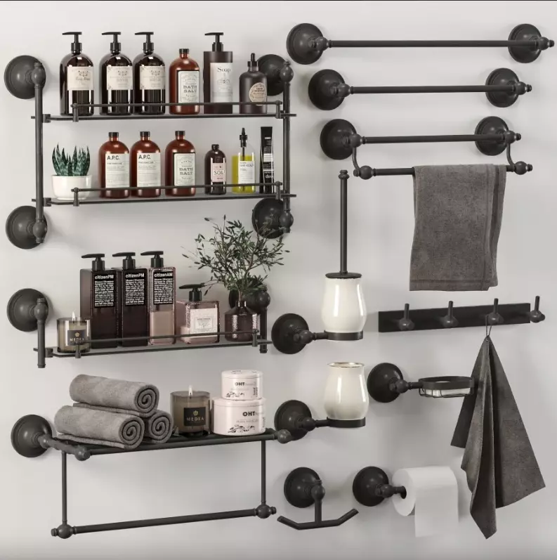 This 3D model features a complete, high-quality collection of bathroom accessories designed in a modern industrial style. The set includes multiple wall-mounted elements such as towel bars, shelves, hooks, soap dispensers, tissue holders, and storage racks. Each item is crafted with detailed geometry and realistic materials, showcasing dark metal finishes and clean structural lines.