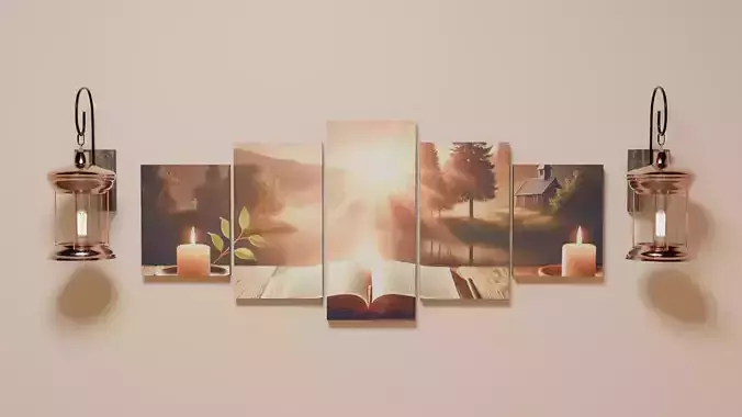 This inspirational wall art piece, titled “Bible in the Sun,” captures a warm and peaceful moment of reflection. A Bible rests on a wooden dock as the setting sun casts golden light across the water, while a small church stands quietly in the distance beneath a glowing sky. The soft tones and balanced composition evoke themes of faith, hope, and serenity. The artwork is divided into five vertically graduated panels, with the tallest at the center, creating a dramatic focal point that enhances its depth and presence. Perfect for living rooms, studies, or places of worship, this piece brings a comforting spiritual atmosphere to any space.