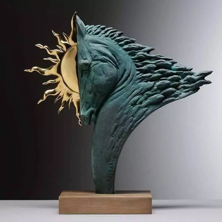 Behind the horse’s head is a radiant golden sun—crafted from polished brass or gold-plated metal—with jagged rays extending outward like fire. This celestial element creates a striking contrast against the dark bronze, symbolizing light, power, and vitality. The interplay between the two materials—cool blue-green and warm gold—evokes themes of duality, balance, and harmony between nature and the cosmos.