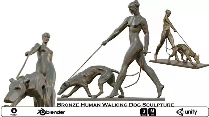 Name: Bronze Human Walking Dog SculptureType: modelFormat: 3Ds Max 2013Export: FBX, OBJRender: VRay (5.x), Corona (6)Polys: 75504Verts: 37968Matclasses: VRayMtl,CoronaMtlUnits: CentimetersDimension: 95.99 x 28.25 x 80.18Date: 2025.11.17