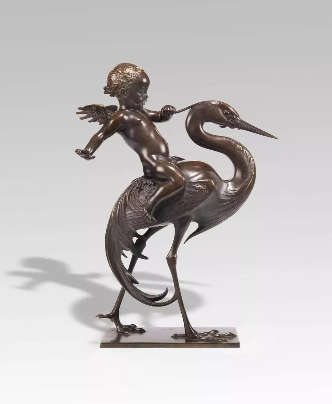 Exquisite 3D model of a classical bronze sculpture depicting a cherubic figure joyfully riding a heron, capturing a whimsical and timeless moment of innocence and harmony with nature. The cherub, with delicate wings, curly hair, and a playful expression, is seated on the bird’s back, holding its long neck gently in one hand while extending the other as if in motion or balance. The heron stands tall and poised, its slender legs firmly planted, curved neck elegantly arched, and feathers meticulously detailed to reflect the texture and flow of real plumage. Crafted in rich, dark bronze with subtle patina effects, the sculpture exudes an antique aesthetic reminiscent of Renaissance or Baroque artistry, blending mythological charm with natural elegance. This piece is ideal for interior decoration, museum displays, artistic collections, or as a symbolic representation of childhood wonder, nature’s grace, or divine playfulness. The 3D model includes high-resolution PBR materials—albedo, roughness, metallic, normal, and specular maps—for realistic rendering in Blender, Maya, 3ds Max, Unreal Engine, or Unity. It features clean topology, precise UV mapping, and optimized geometry suitable for both real-time applications and cinematic visualizations. Perfect for use in architectural visualization, storytelling projects, game environments, or as a standalone collectible asset. Whether you're designing a fantasy world, creating a historical scene, or seeking a unique decorative element, this sculpture adds a touch of poetic beauty and cultural depth.