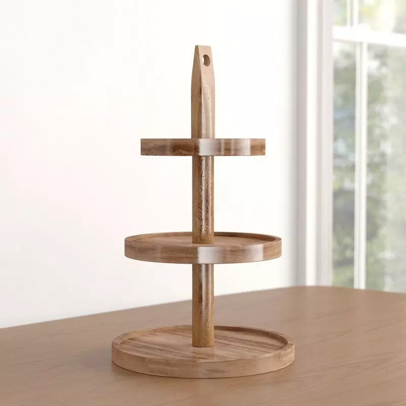 • Put pastries proudly on display with this three-tiered dessert stand, a versatile addition to your entertainment arsenal. Crafted from solid mango wood, this food-safe piece sports a natural brown finish for a warm and rustic touch. Its clean lines and understated design give it a modern and minimalist feel.