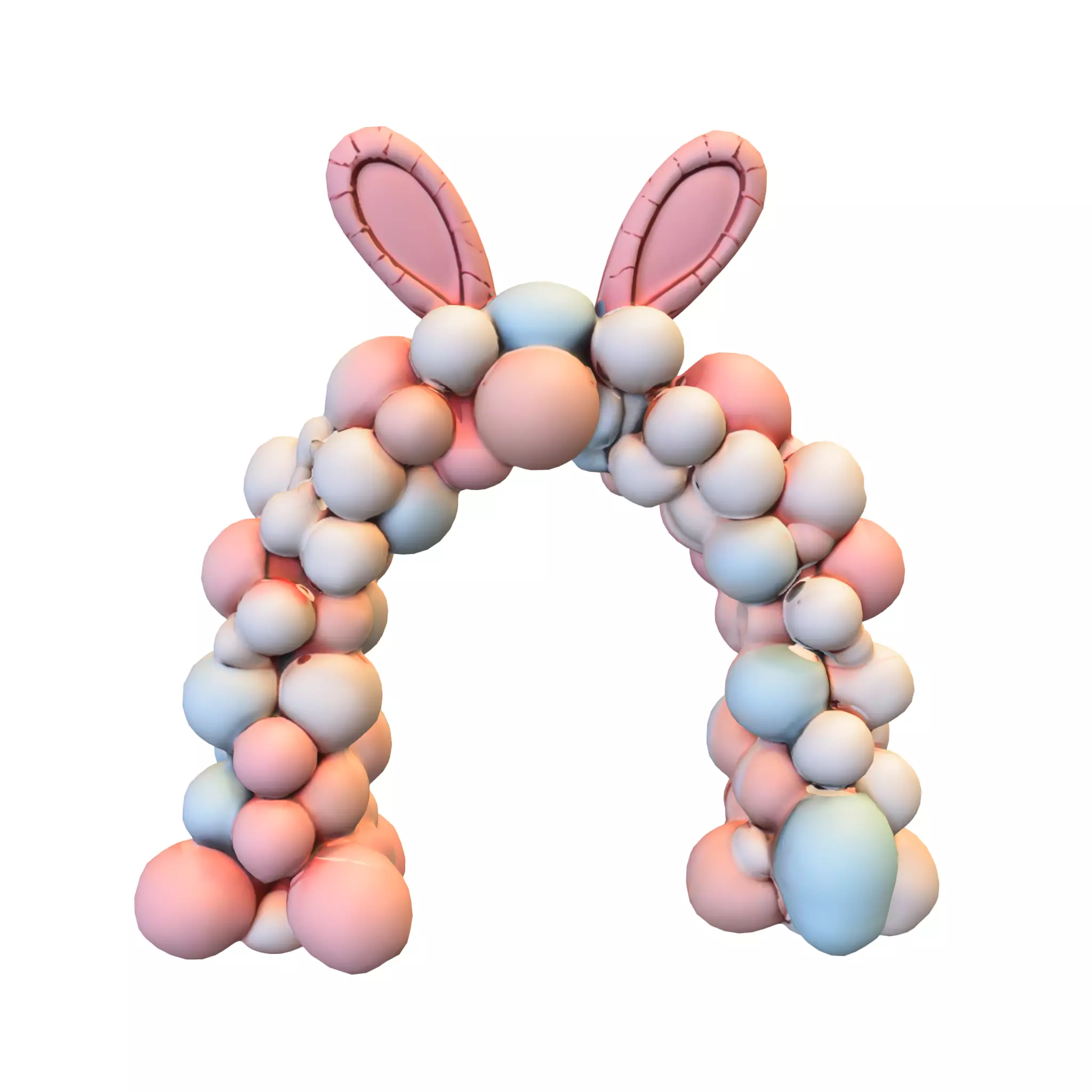 A playful and colorful 3D model of a bunny-themed balloon arch, designed with pastel pink and blue balloon clusters and bunny ears at the top. Perfect as a decorative prop for festive or party environments in games such as The Sims, Roblox, Fortnite Creative, VRChat, Unity, and Unreal Engine. This model can be used as an event decoration, thematic entrance, or fun accessory in virtual worlds. It is also suitable for 3D printing, making it ideal for party decor miniatures, cake toppers, or festive displays. Provided in OBJ, FBX, STL, DAE, PLY, GLB, and Blender formats.