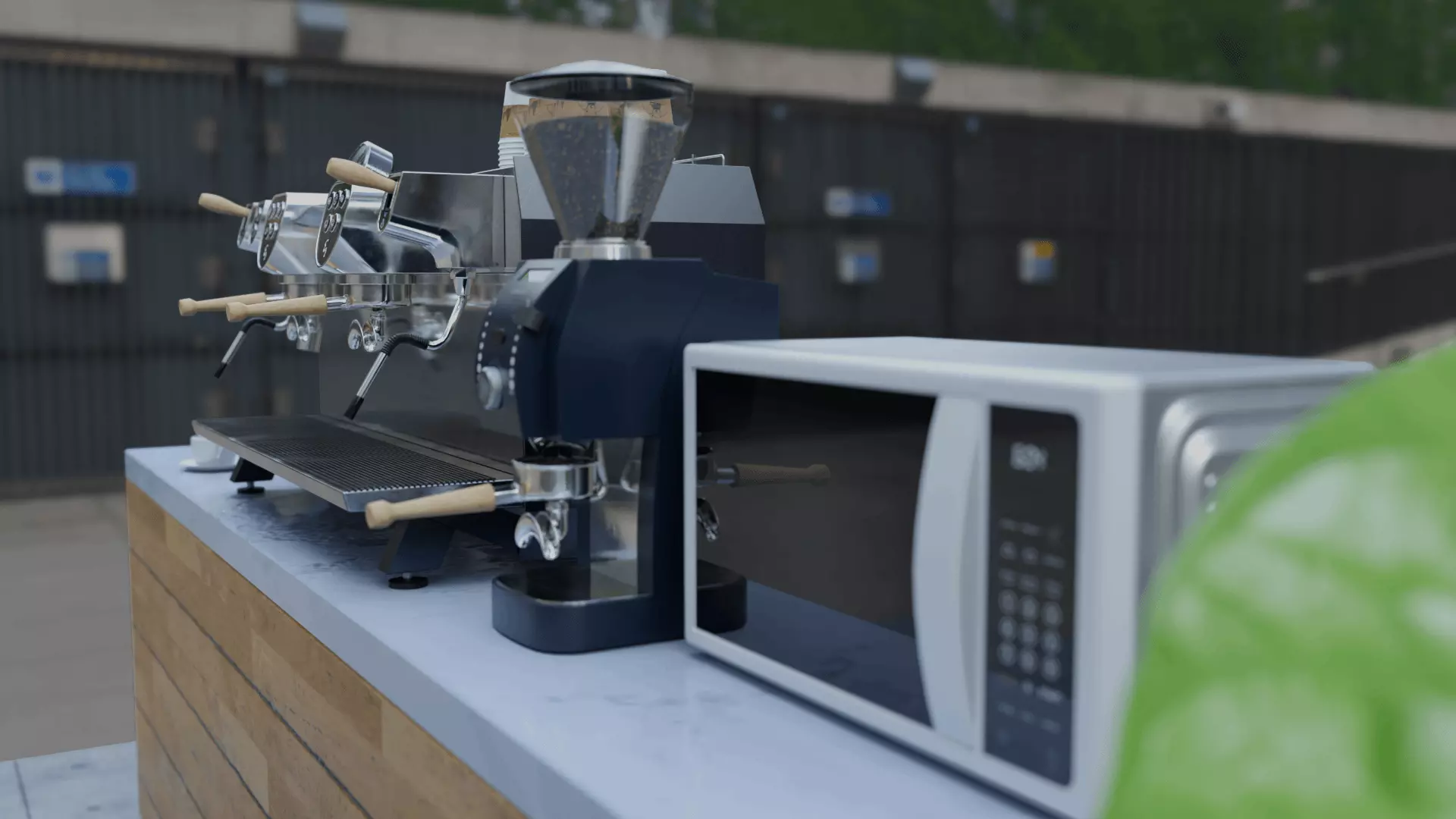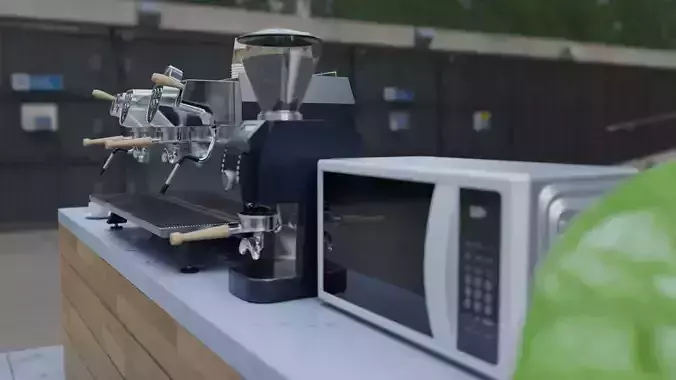 Models Count: 7 (Espresso Machine, Coffeegrinder, Microwave, Decorative plant, Countertop, Ceramic cup, Plastic to go cups)