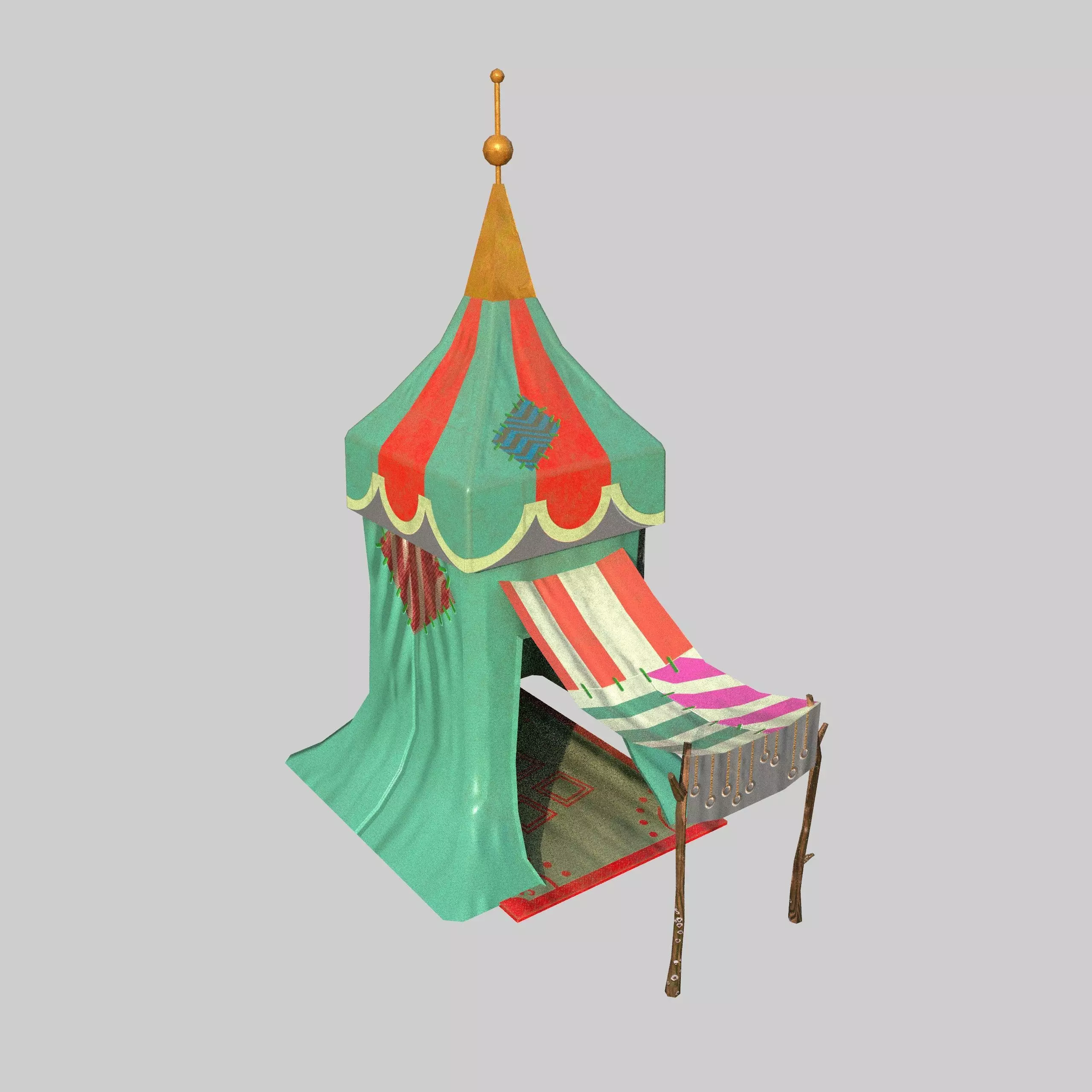 This model captures the nostalgic charm of an old-fashioned carnival or fairground tent with fabric patches, detailed canopy edges, and wooden support poles. Perfect for VR/AR experiences, gaming environments, or animated entertainment scenes that need a touch of whimsy and festivity.