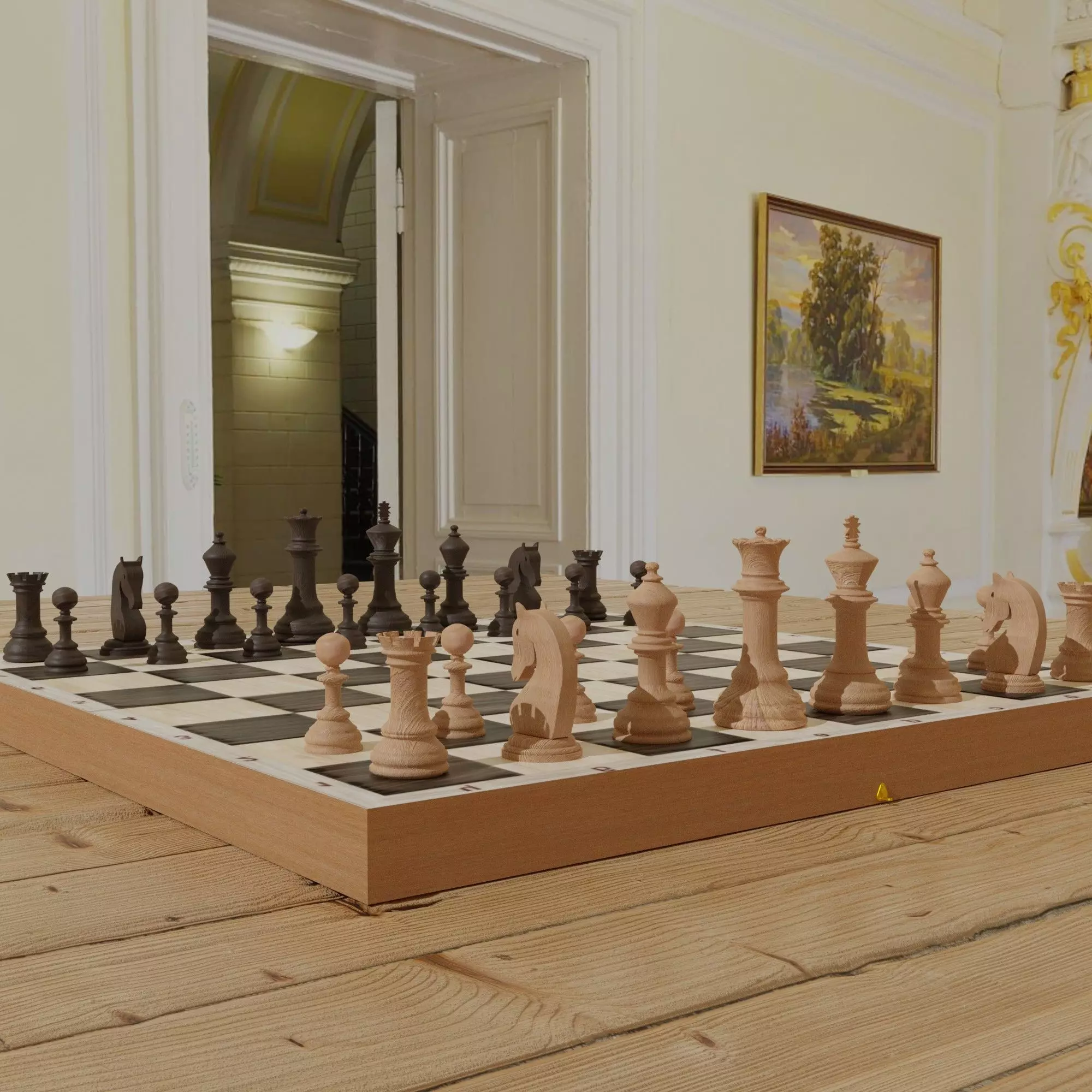 Chessboard model cobined with backgammon.Here is a 3d model of a chessboard with figures, checkers.The figurines as well as the daughter herself are made according to the sizes of the original models.In this product you get a chess board with figures and also checkers for playing checkers and backgammon.Inside the board there are special compartments for playing backgammon.There are only 15 pieces for checkers and backgammon.The dimensions of the glasses are exactly the same as the original. The idea was completely invented by the author of the project. All textures, as well as the models themselves, are zipped in a zip file. All textures are in 4k resolution.