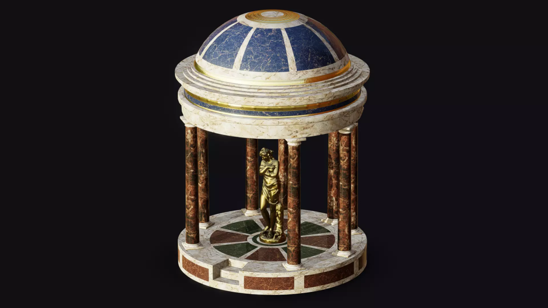 A high-quality 3D model of a classical circular temple featuring a central statue and detailed materials. Includes ornate columns, a domed roof, and decorative flooring. Ideal for historical, mythological, or architectural scenes. Game-ready with PBR textures and clean topology.