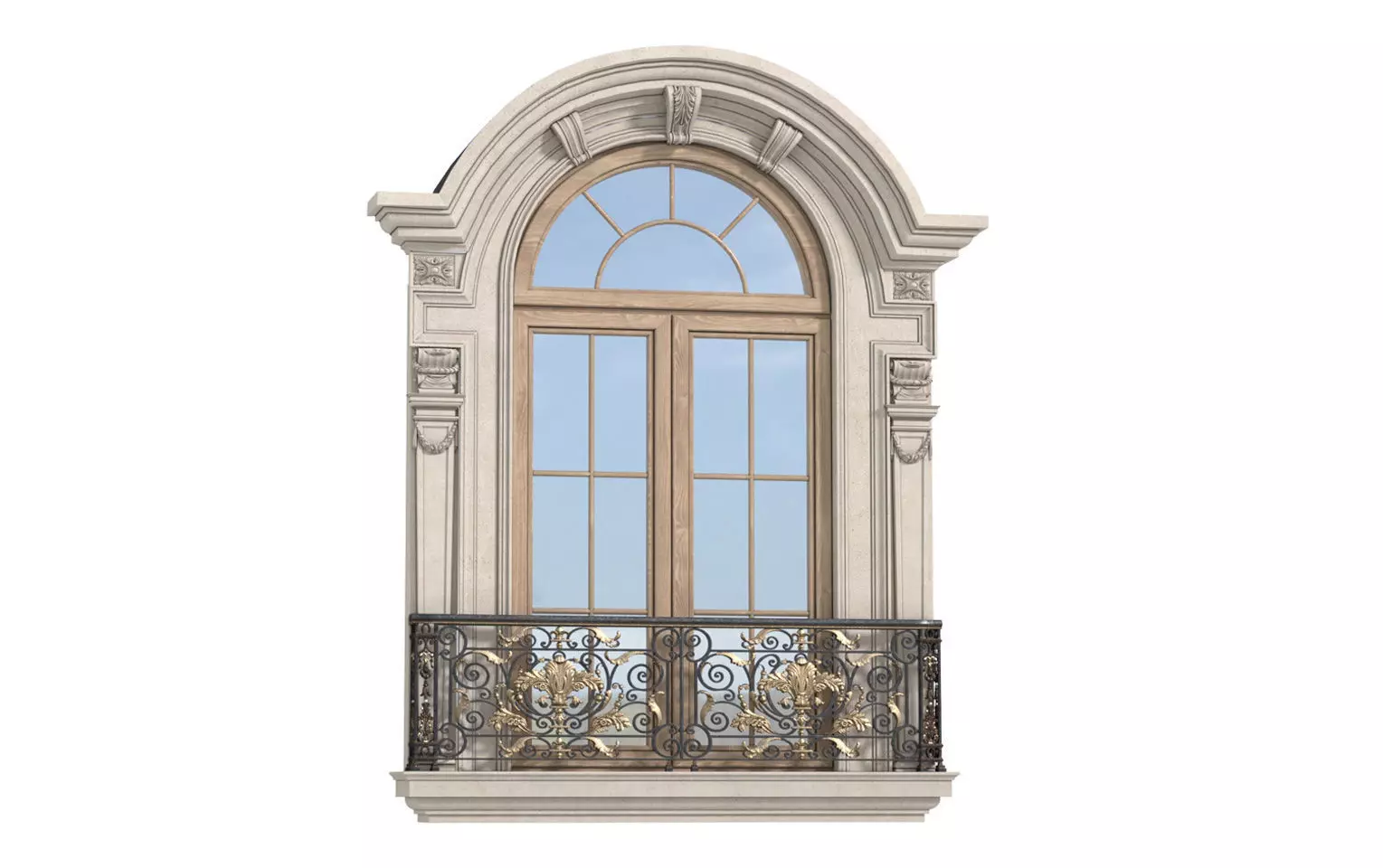 Wooden arched window and framing with a french wrought iron balcony railing for a facade in a classic style