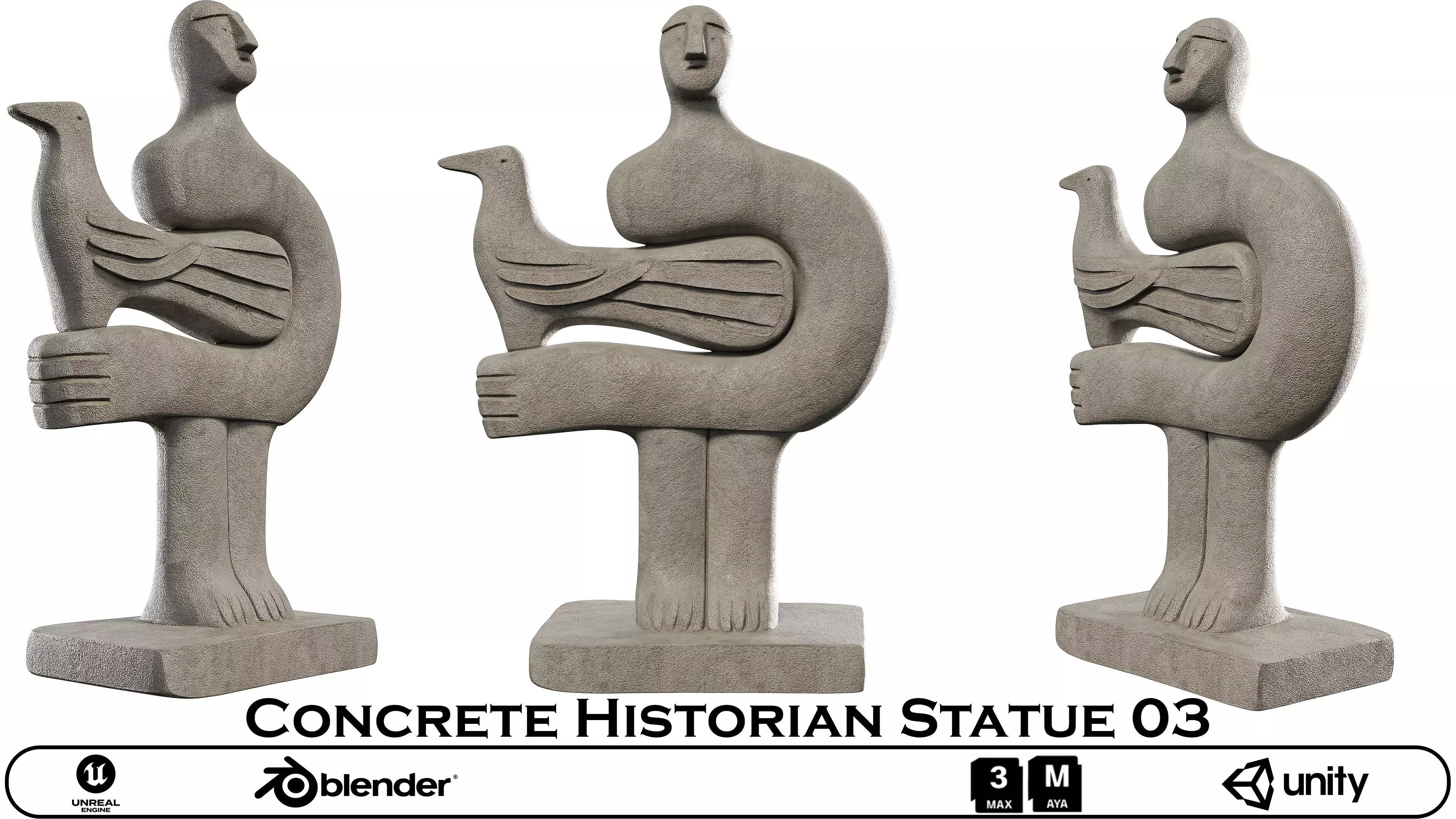 Name: Concrete HIstorian Statue 03Type: modelFormat: 3Ds Max 2013Export: FBX, OBJRender: VRay (5.x), Corona (9)Polys: 18749Verts: 18744Matclasses: VRayMtl,_CoronaPhysicalMtlUnits: CentimetersDimension: 69.03 x 30.34 x 99.93Date: 2025.8.20A highly detailed and realistic 3D model of an abstract concrete statue depicting a stylized human figure holding a bird-like creature. This brutalist-style sculpture is perfect for adding a modernist, historical, or artistic touch to your scenes. Ideal for architectural visualizations, game environments, and stylized renders.This premium 3D model is a captivating artistic representation, meticulously crafted to resemble a professional concrete sculpture. The piece, titled Concrete Historian Statue 03, features a stylized human figure with bold, block-like features holding an elegant, simplified bird. The design has a primitive yet modern feel, with a strong focus on form and texture. The model is expertly textured to replicate the raw, grainy appearance of concrete, complete with subtle imperfections and a uniform gray tone, giving it an authentic, art-piece quality.