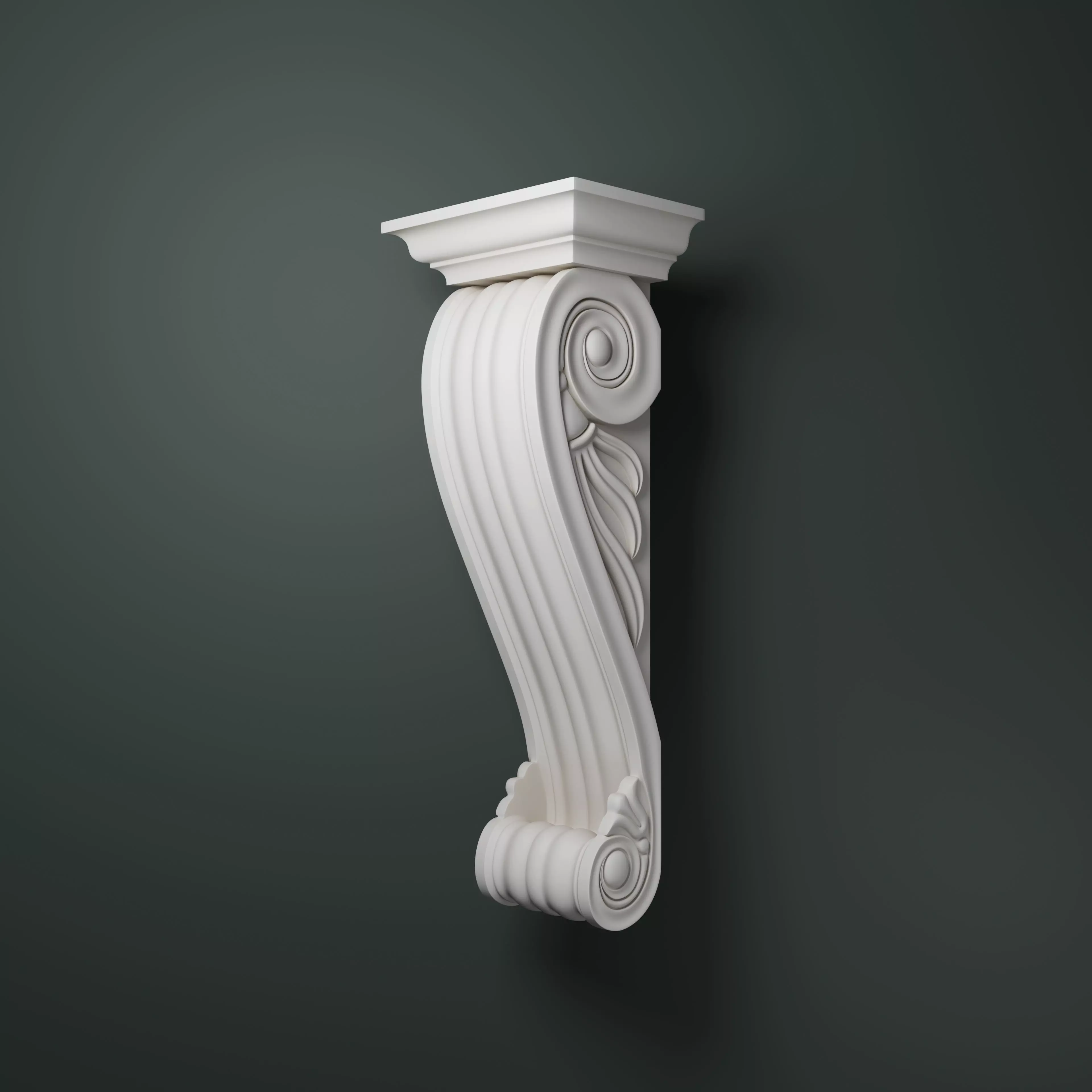 This is a model of a decorative classical corbel. Traditionally corbels are a bracket that extends from a wall to support a structure above it and is an architectural feature that has been used throughout many centuries and in many different cultures. They are usually made from stone, plaster, wood or metal and used on exteriors and interior features.
