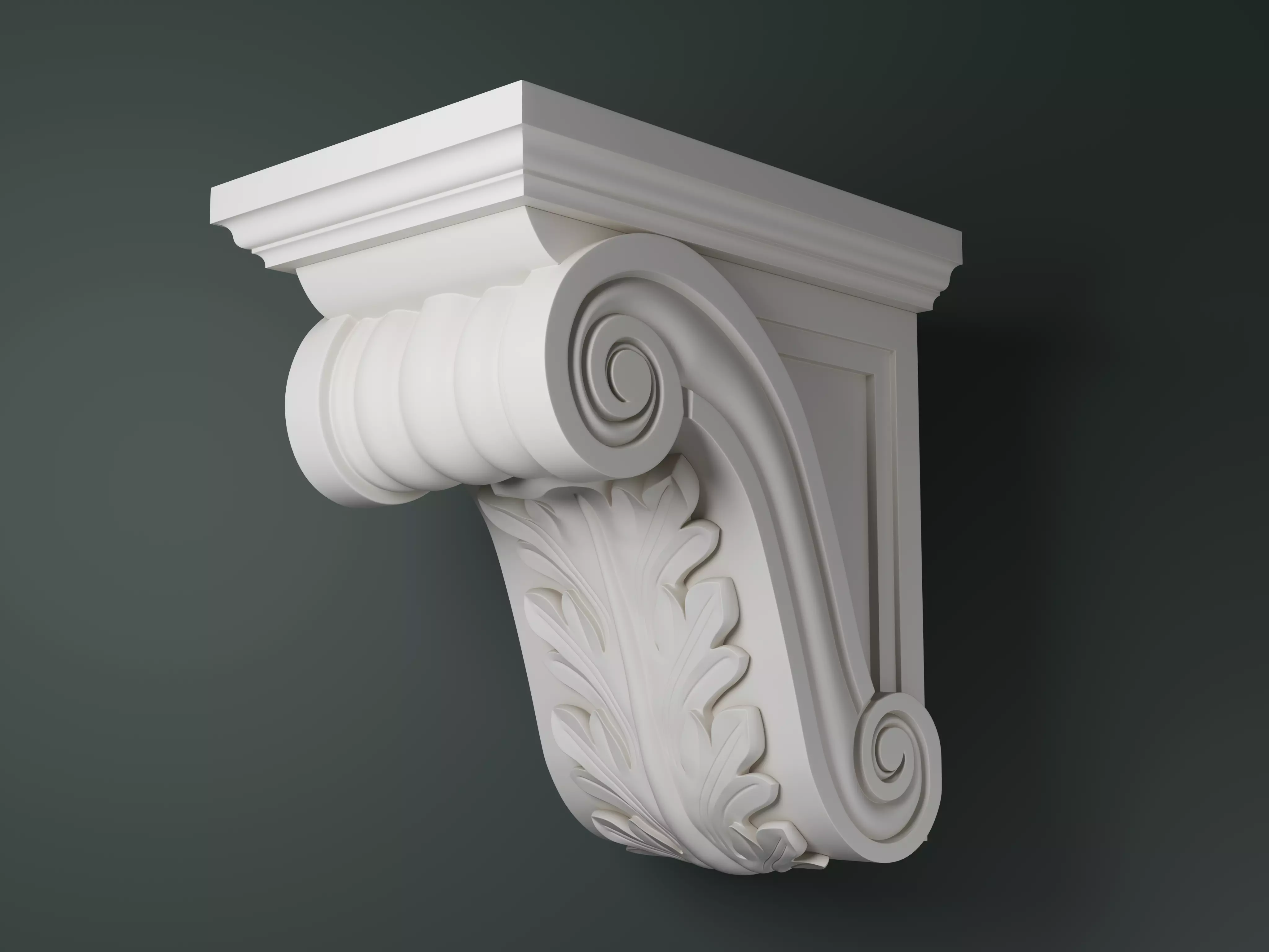 This is a model of a decorative roman/classical corbel. Traditionally corbels are a bracket that extends from a wall to support a structure above it and is an architectural feature that has been used throughout many centuries and in many different cultures. They are usually made from stone, plaster, wood or metal and used on exteriors and interior features.
