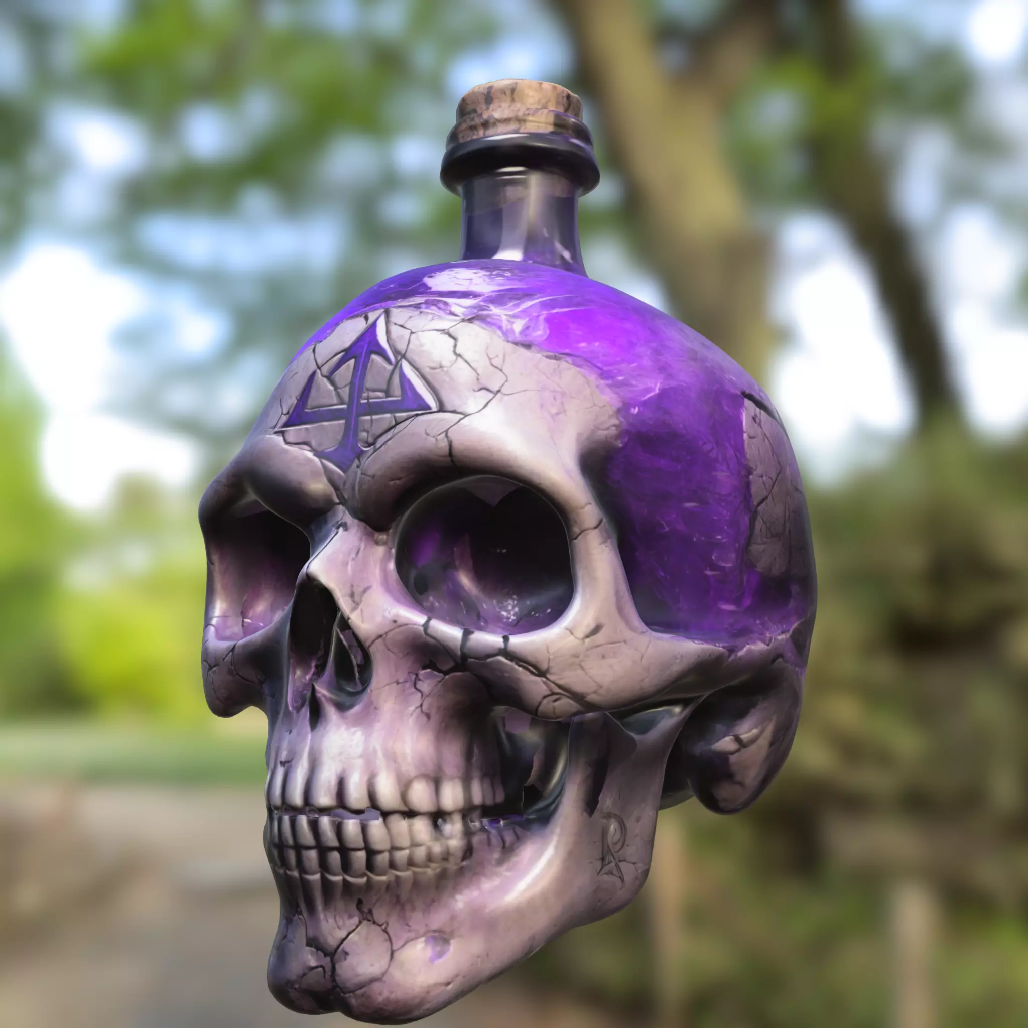 The Cursed Skull Elixir Bottle is a high-fidelity 3D model of a dark fantasy potion flask, uniquely shaped like a cracked human skull infused with arcane purple energy. An ominous rune is carved into the forehead, symbolizing forbidden magic or necromancy. Ideal for RPGs, dark fantasy, or horror-themed games.
