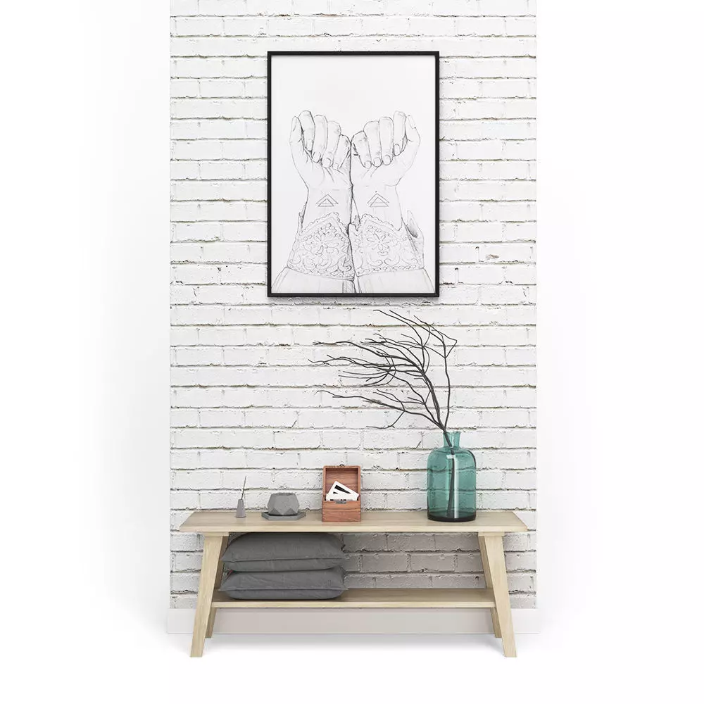 Set of 3D models for interior decoration. Contains a wooden bench with two pillows with leather strips on the shelf and a couple more objects arranged on it - big glass vase with dry twigs, prints box filled with photos, geometric concrete pot and small concrete vase with willow twig. Big poster with hand draw picture is hanging on the white brick wall.