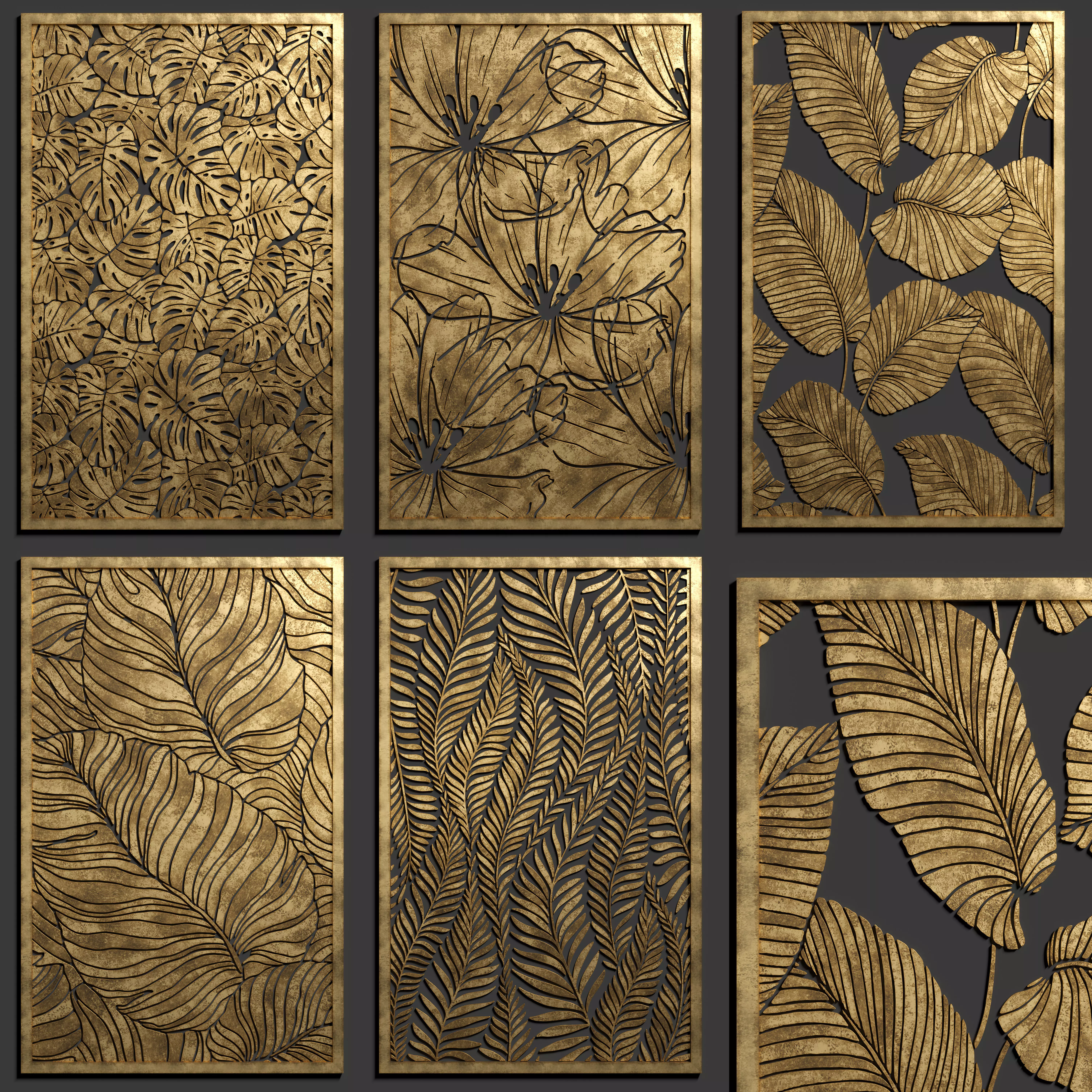 The set includes 5 panels.Each has the following dimensions: 240cm * 150 cm * 2cm.Gold material set for Corona renderer.DWG file is clean and ready for CNC, Corel draw, ...Quad meshes and fully unwrapped.