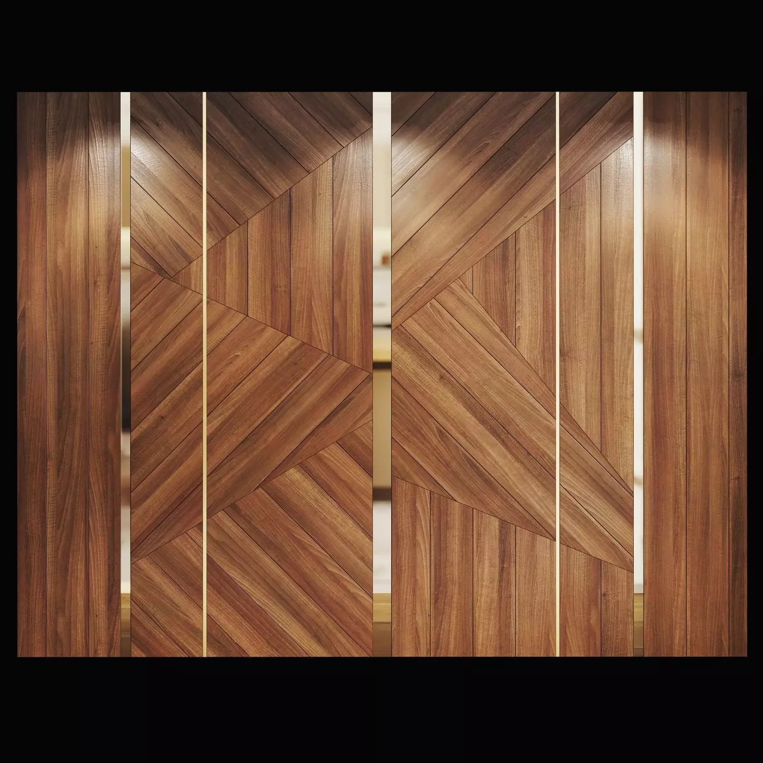 Wall panels in walnut veneer with brass and bronze glass inserts