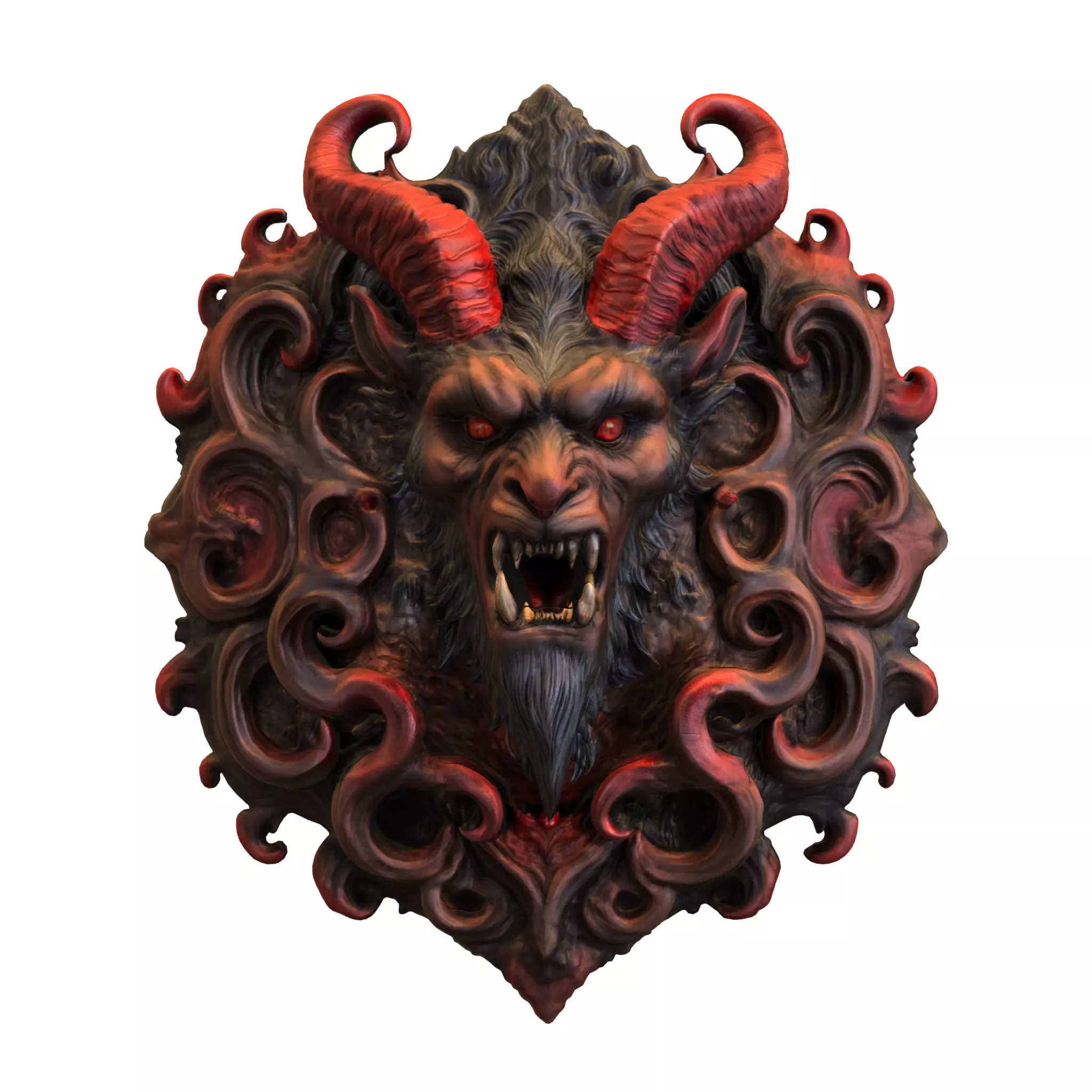 -> A collection of two highly detailed 3D demon skull models with gothic ornamental designs. Includes a horned demonic skull with glowing red eyes and a terrifying red horned demon head with sharp fangs. Perfect for dark fantasy and horror projects, 3D printing, games, sculptures, collectibles, and gothic wall decorations. Ideal for fans of demonic art, occult aesthetics, and fantasy creatures.