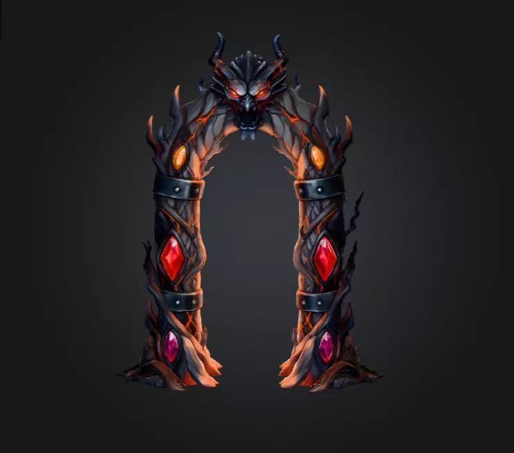 At the peak of the arch rests a horned demonic visage, sculpted with a predatory snarl and glowing ember-like eyes that seem to follow intruders. This grim guardian not only reinforces the portal’s infernal aesthetic but also suggests a deeper lore: the structure may be sentient, cursed, or bound by ancient rituals. Flames and lava-like fissures pulse within the creature's layered horns and jagged features, creating the illusion that the portal is fueled by living inferno.