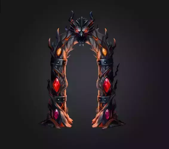 Embedded throughout the arch are four glowing crystals—radiant red, fiery orange, and haunting magenta—each wrapped in metal plates and bound with corrupted roots. These crystals function as visual energy cores, radiating magical heat and channeling power into the structure. Their polished facets contrast starkly against the charred, organic textures, producing a dramatic visual rhythm of light and shadow. Subtle emissive veins run from each gem to the base of the portal, giving the model a dynamic, supernatural glow ideal for dark fantasy gameplay.