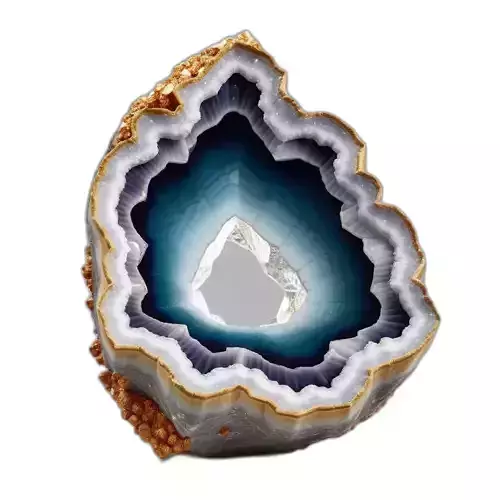This highly detailed 3D model meticulously represents a captivating cross-section of a natural geode, showcasing its intricate internal crystal formations and distinct banded agate layers. The model features a striking gradient of deep blues and purples, transitioning to a sparkling white crystal interior, all encased within a realistically textured outer rock shell with subtle golden accents. It is perfectly suited for a wide array of digital applications, including enhancing architectural visualization projects, serving as a stunning centerpiece in luxury interior renders, or enriching immersive AR/VR experiences. Game developers will find it an excellent environmental prop or collectible item, adding a touch of natural wonder to virtual worlds. This versatile asset is also ideal for digital art compositions, educational simulations, or even as a base for custom jewelry design visualizations. The model boasts clean topology, ensuring smooth deformations and easy integration into any scene, and is fully UV unwrapped for efficient texture application. It comes with high-resolution PBR textures to deliver stunning visual fidelity in both real-time engines and offline renderers. Provided in multiple industry-standard formats, including GLB, OBJ, FBX, and STL, it offers broad compatibility. Additional formats like ABC, DAE, USD, and PLY can also be supported upon request. Whether you need a visually rich asset for static renderings or an optimized model ready for subdivision, this geode provides exceptional realism and quality, making it a valuable addition to any 3D asset library.