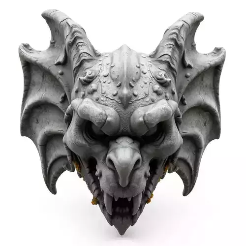 This is a meticulously crafted 3D model depicting a formidable gothic gargoyle head, rendered with exceptional detail to emulate ancient, weathered stone. The sculpture features an imposing expression, characterized by large, menacing eyes, a prominent hooked snout, and razor-sharp fangs. Intricate details such as large, ram-like horns and stylized bat-like wings frame the creature's head, enhancing its mythical presence. The stone texture is rich with realistic cracks, fissures, and subtle organic growth, hinting at centuries of exposure to the elements. This model is perfectly suited for a wide array of digital applications, including adding atmospheric elements to dark fantasy game environments, enhancing architectural visualizations of historic or gothic structures, or serving as a captivating prop in film and animation projects. Its high level of detail also makes it an excellent candidate for high-resolution renders, digital art compositions, and even for preparing high-quality 3D prints to create physical collectibles. The asset is provided with clean topology, and while optimized for high-fidelity static renders and cinematics, it can also be retopologized for real-time applications such as VR/AR experiences or game development. It includes industry-standard PBR textures for realistic material representation and is likely UV unwrapped for easy texture application. Common file formats like GLB, OBJ, FBX, USD, DAE, and STL are typically supported, ensuring broad compatibility across various 3D software.