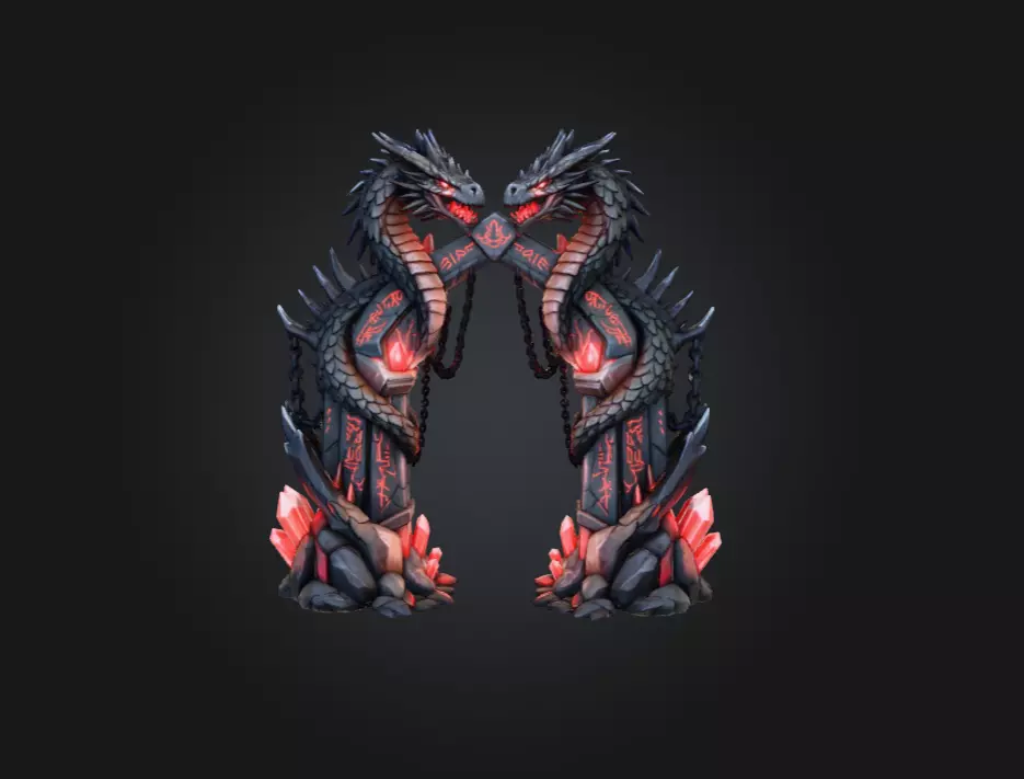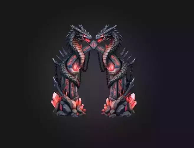 The entire structure radiates a sense of forbidden mysticism, as though it once served as a threshold between realms—perhaps a gateway to draconic sanctuaries, forgotten battlefields, or worlds ruled by primordial fire and shadow. Adventurers might approach it with reverence or fear, knowing that crossing beneath the intertwined dragons could awaken ancient wards or summon the spectral guardians that once defended it. Whether placed in a fantasy RPG, a mystical open-world environment, or an ominous dungeon throne room, the Dragon Gate instantly transforms the setting into a place steeped in legend and arcane grandeur. It is not merely a structure but a story, etched in stone and magic.