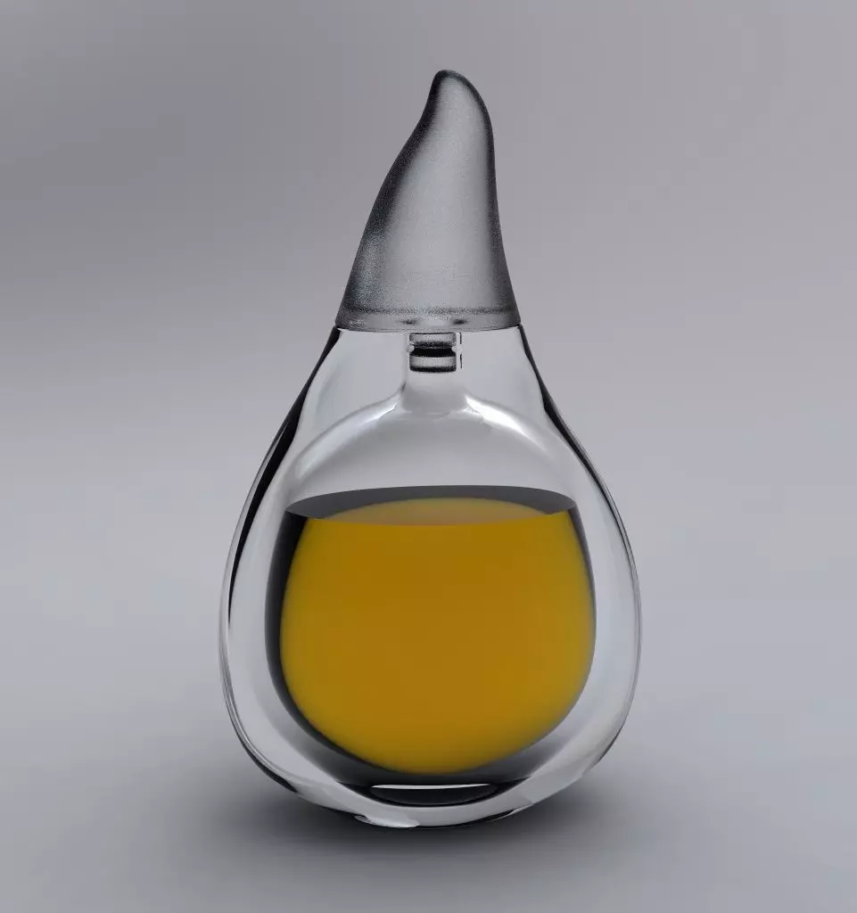 When defining the shape of the bottle, I sought the maximum simplicity and purity of shapes. I wanted to evoke the liquid in its natural state, without being supported by any means, and also the movement it has.