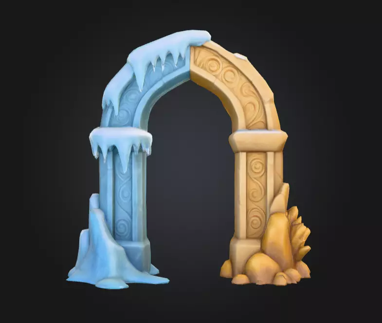 Whether placed as the centerpiece of a fantasy game level, a mythical RPG dungeon, a magical open-world adventure, or an animated cinematic sequence, the Eternal Seasons Archway instantly conveys storytelling potential. It can serve as a portal between fire and ice biomes, a mystical shrine for elemental magic, or a ceremonial gateway representing duality and balance. Every detail—from the subtle color gradients to the intricate carved patterns—has been carefully designed to achieve both visual harmony and narrative depth.