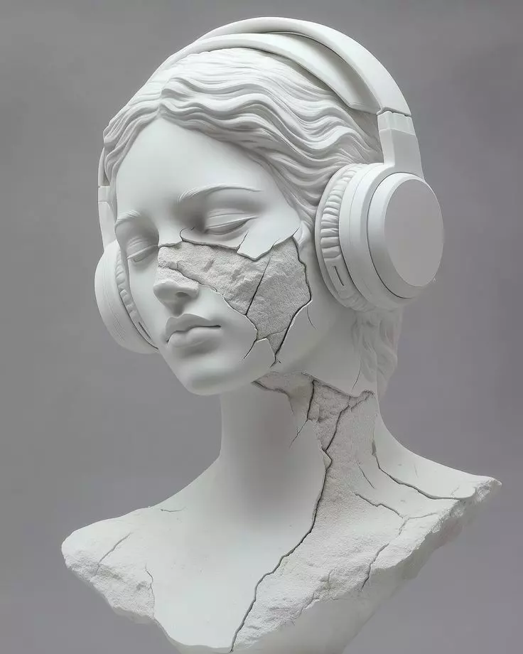 This 3D model captures a fragmented marble bust of a serene woman wearing oversized white headphones, evoking themes of isolation and digital immersion. The sculpture’s cracked surface reveals raw, unpolished edges, contrasting with the smooth, polished areas of her face and hair. Her eyes are closed, suggesting introspection or escape into music, while the headphones dominate the composition, blending technology with classical artistry. Key attributes include: