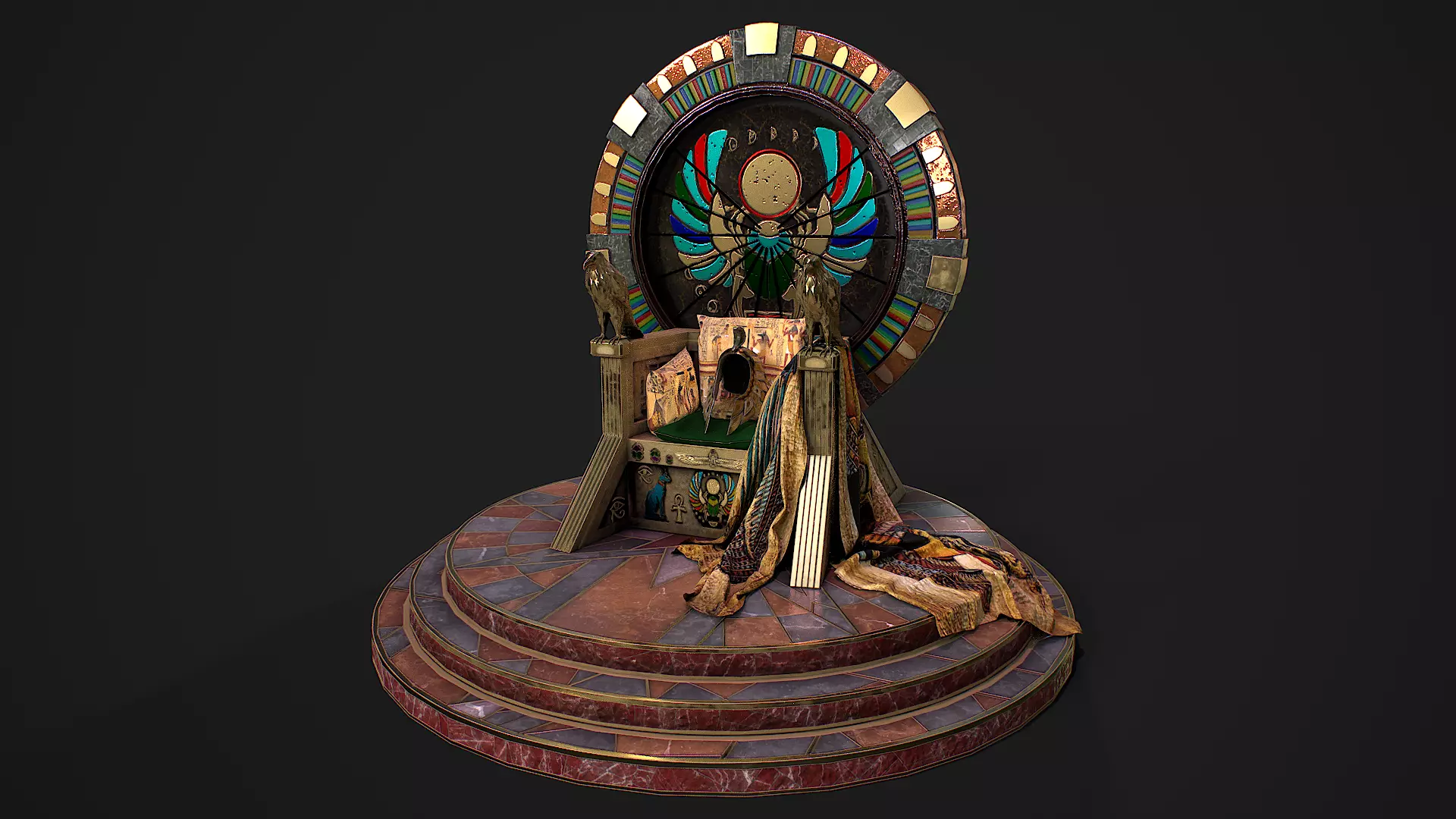 Hello. This is a high definition quality polygon of a Egyptian throne with accessorie 3D Model with PBR textures. Extremely detailed and realistic. Suitable for movie prop, architectural visualizations, advertising renders and other. The archive includes Obj and FBX, textures for the Unity: Base color, Height, Metallic, Mixed AO, Normal_OpenGL, Roughness. And also included in the archive textures for UE: BaseColor, Normal, OcclusionRoughnessMetallic. Textures for the throne 8K other textures 4K. The number of materials corresponds to the number of main objects in the scene. The model contains 7 object: cloth, crown, Egyptian_throne, pillow_1, pillow_2, pillow_2_1, pillow_3. If you need, we will make a file of this model for 3D printing especially for you.