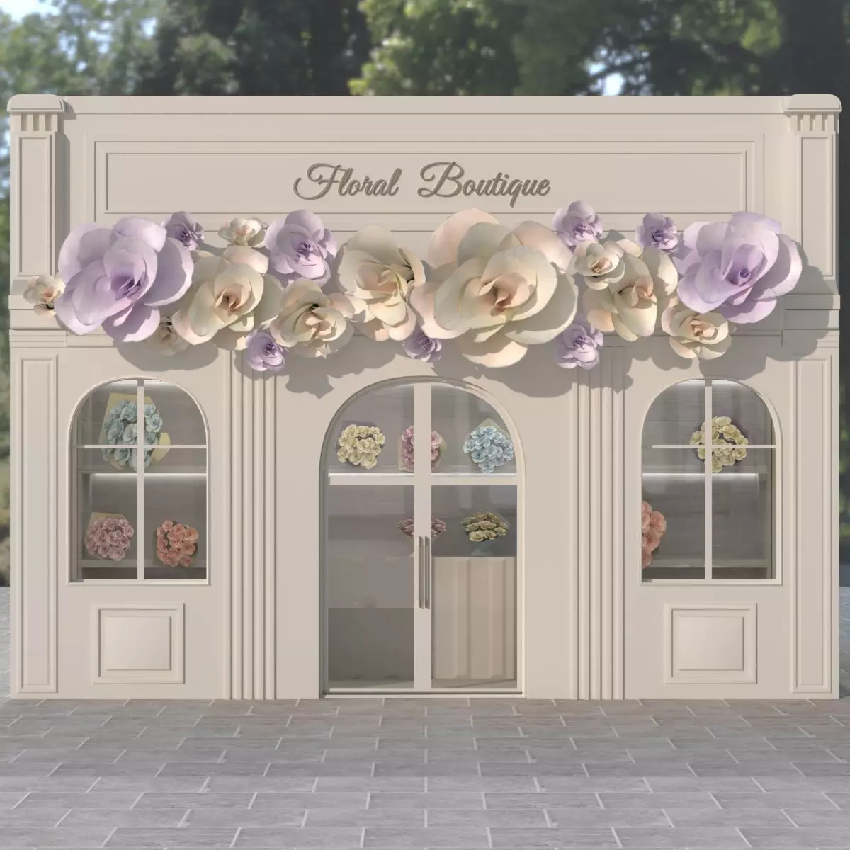 A charming and highly detailed 3D model of a Floral Boutique storefront, perfect for architectural visualization, whimsical scene renders, event backdrops, or creating a unique focal point in your projects. Features intricate white paneling, large arched windows, a double-door entrance, and a beautiful arrangement of stylized pastel flowers adorning the facade.