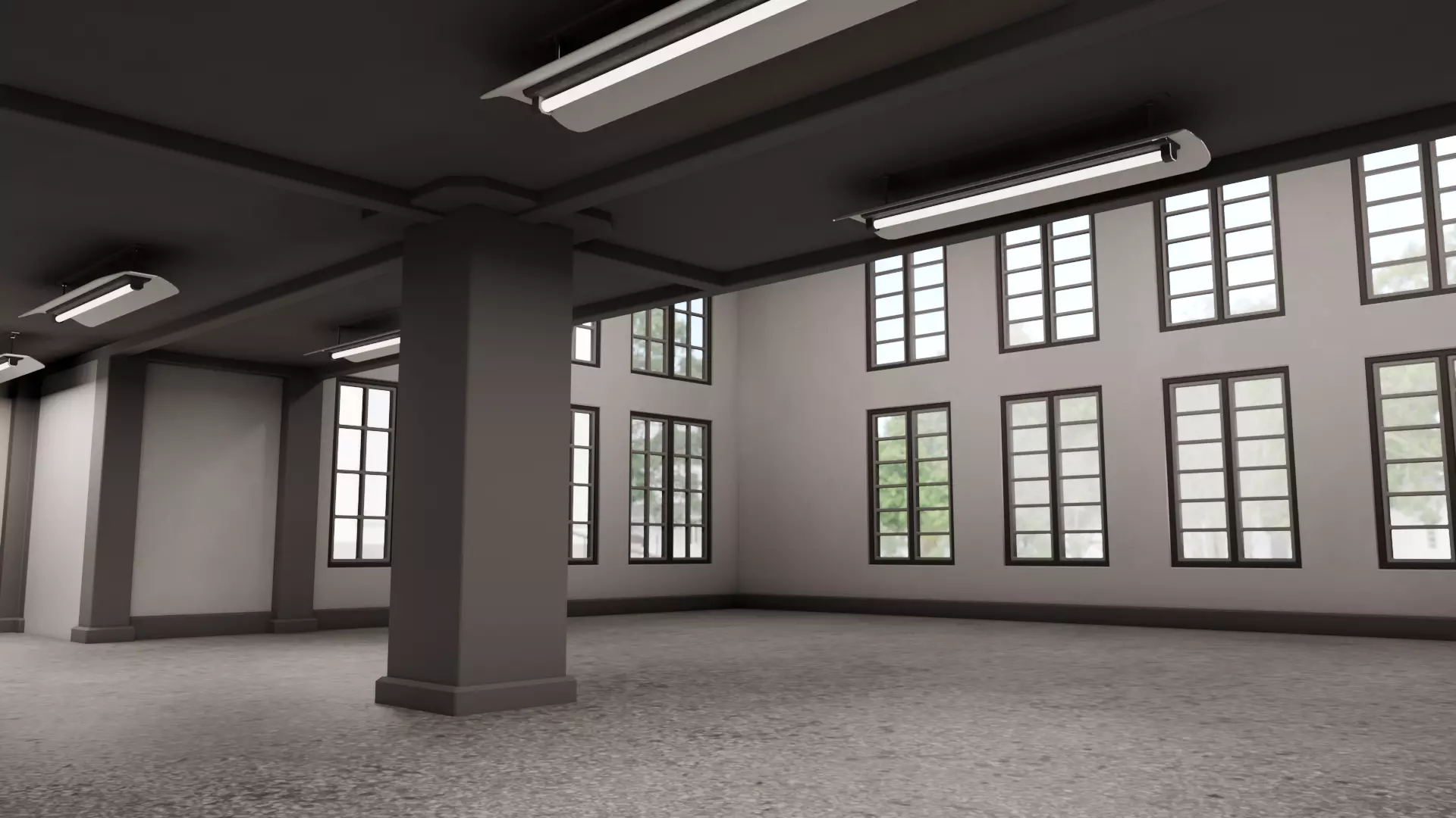 This product is a detailed industrial-style interior scene prepared for Blender Eevee, designed for real-time visualization, interior previews, and animated walkthrough renders.The scene features a spacious interior with large window openings, structural columns, upper and lower floor levels, and ceiling-mounted lighting fixtures. Materials and lighting are set up specifically for Eevee.Three cameras are included in the scene, each animated with dolly camera movement to present the interior from different perspectives. Preview animations are provided between the product images.