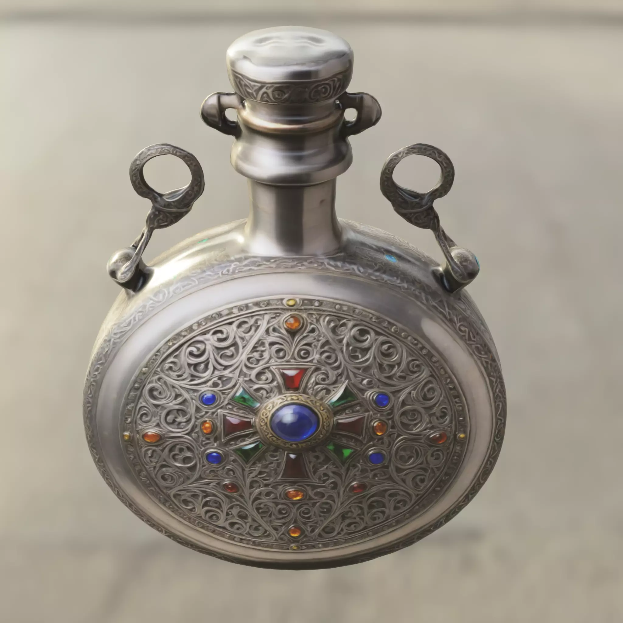 The Enchanted Relic Flask is a highly detailed 3D fantasy potion bottle featuring intricate filigree metalwork, gemstone inlays, and a mystical symmetrical design. Perfect as a magical elixir container, quest item, or mystical relic in RPG, adventure, or fantasy-based games.