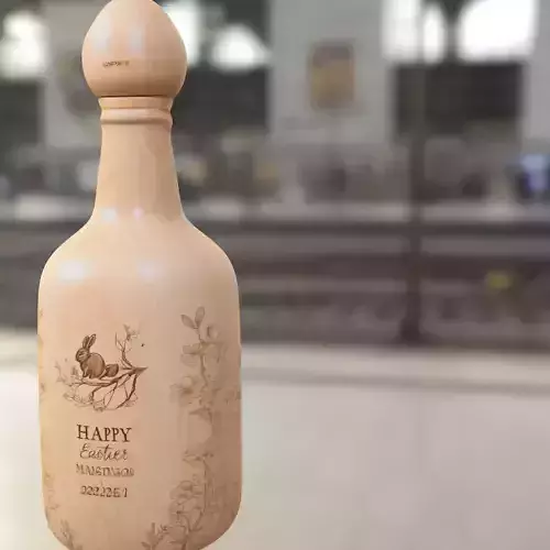 This elegant 3D model presents a smooth, natural wooden bottle featuring intricate laser-style engravings of a bunny, floral elements, and Easter-themed text. Designed as a decorative asset, it fits perfectly in cozy, seasonal, or rustic environments in games like Animal Crossing, The Sims, VRChat, and Roblox.