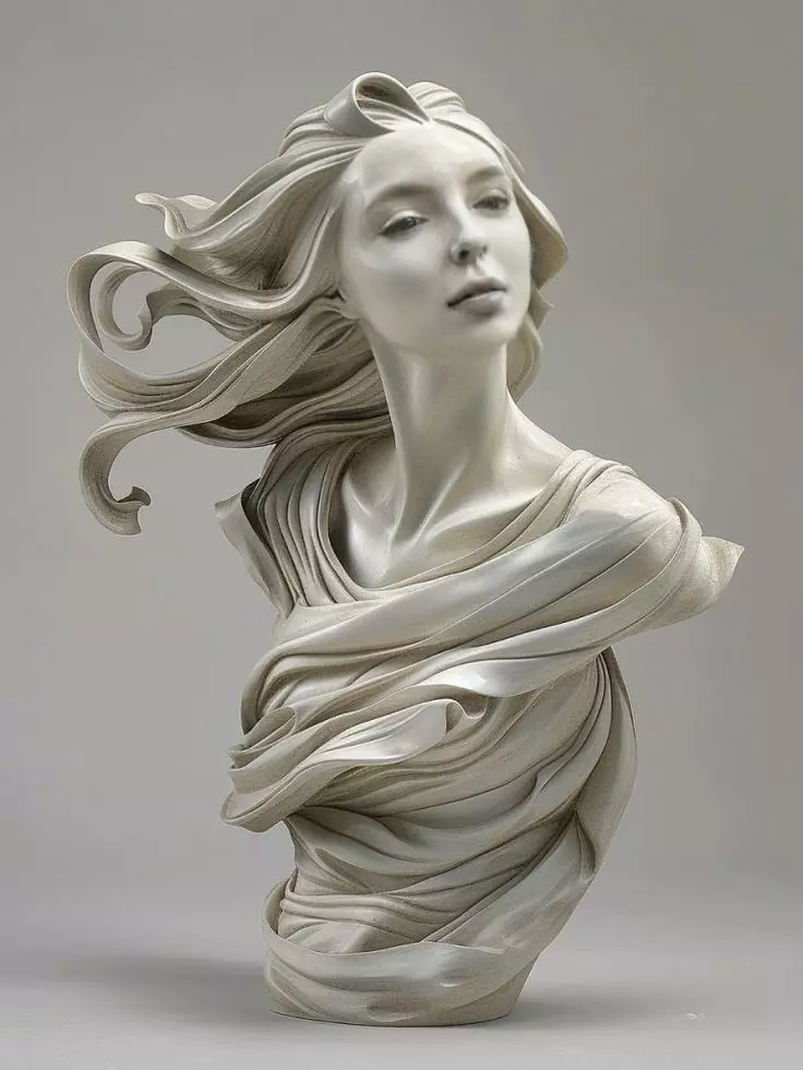 This 3D model captures the serene beauty of a female bust, sculpted in smooth white marble with dramatic, flowing hair and elegant draped fabric. The subject’s head tilts upward, eyes half-closed in contemplation, while her hair cascades dynamically around her shoulders, blending seamlessly into the fluid folds of the garment. The interplay of light and shadow accentuates the sculpture’s textured surfaces, from the delicate curls of her hair to the rippling fabric that clings to her form.