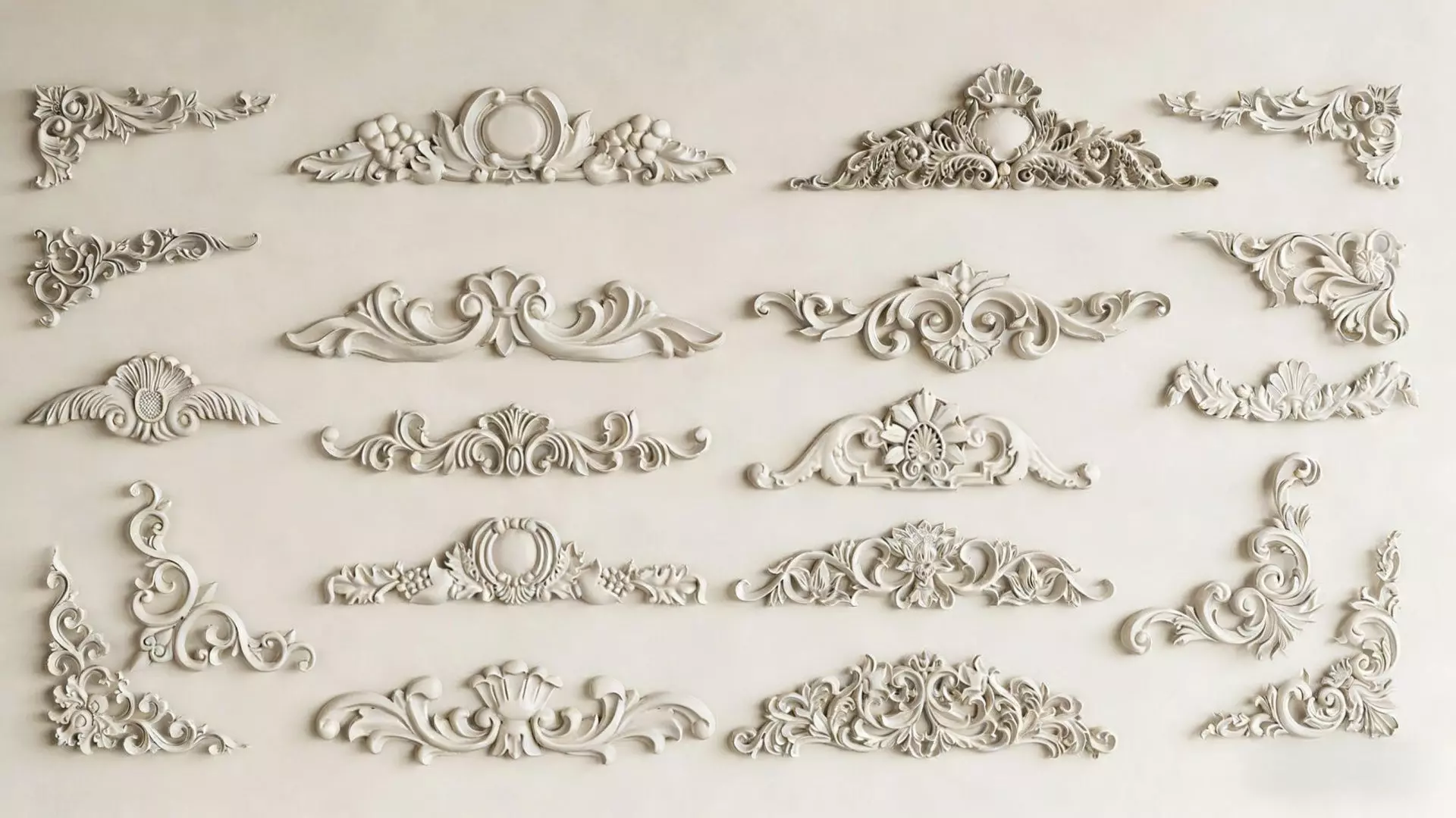 This set of pictures showcases a variety of European classical-style gypsum carved decorative components, including lintel carvings, corner carvings, wall friezes and other forms.The design integrates the elaborate opulence of Baroque with the soft curves of Rococo, taking scrolling foliage, flowers and volutes as the core elements. With the delicate texture of bas-relief, it presents an elegant and retro visual effect.These components can be used for decorating walls, door frames and furniture surfaces, adding a strong French court atmosphere and classical aesthetic texture to the space. They are the finishing touch soft furnishings for creating retro, light-luxury and European-style spaces.