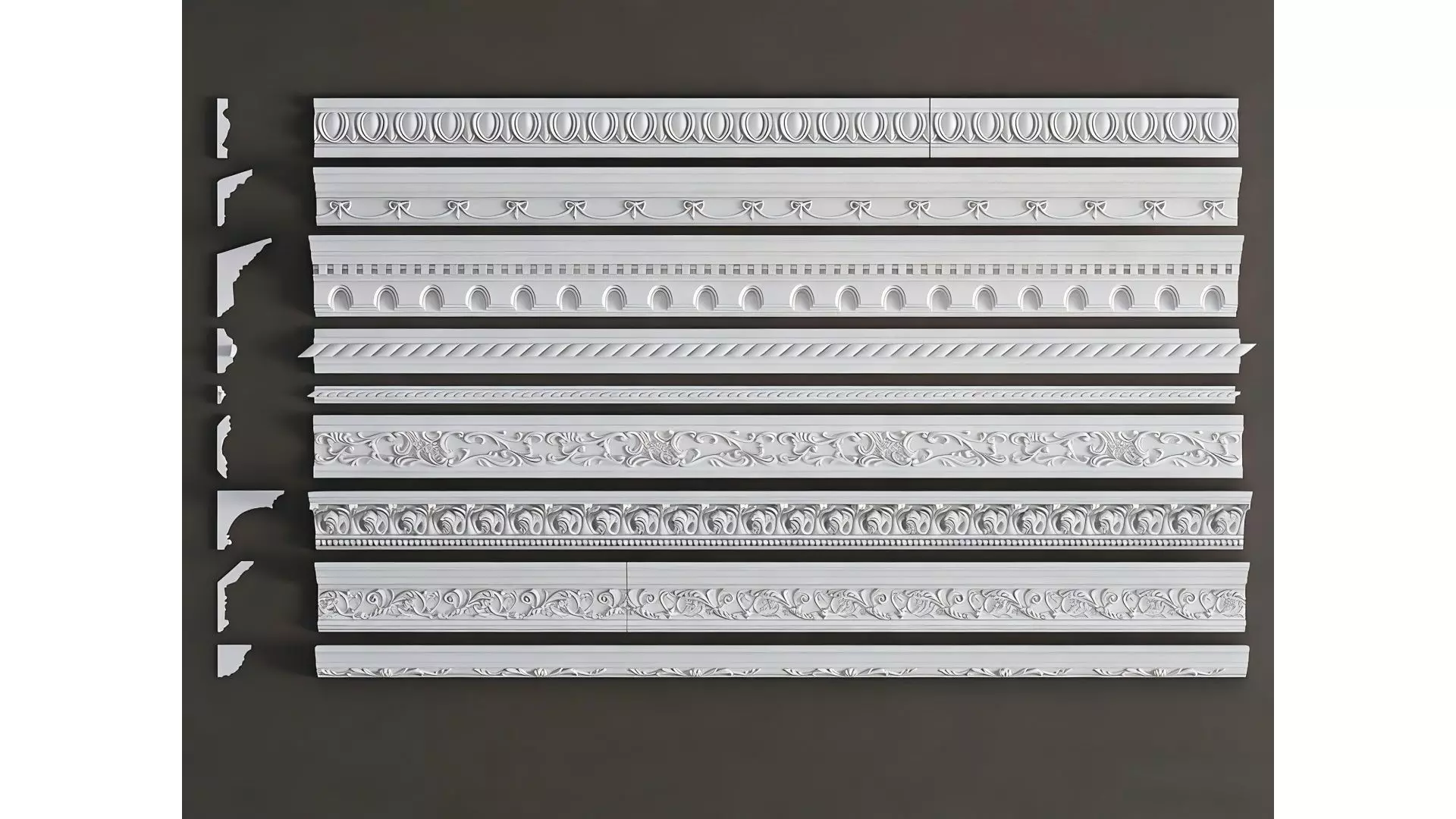 A curated selection of plaster decorative mouldings in European/French styles, featuring various specifications such as flat mouldings and cornices. The surfaces are intricately carved with classic vintage patterns like acanthus scrolls, beaded motifs, and twisted rope designs, with delicate and three-dimensional reliefs and a smooth, pure white finish.These mouldings are suitable for a variety of interior decoration scenarios, including ceiling trim, feature wall borders, and wall chair rails. They are compatible with materials such as plaster and PU, combining classical aesthetics with practical functionality. They are ideal decorative elements for light-luxury home renovations and retro commercial fit-outs, and also serve as excellent reference materials for 3D modeling.