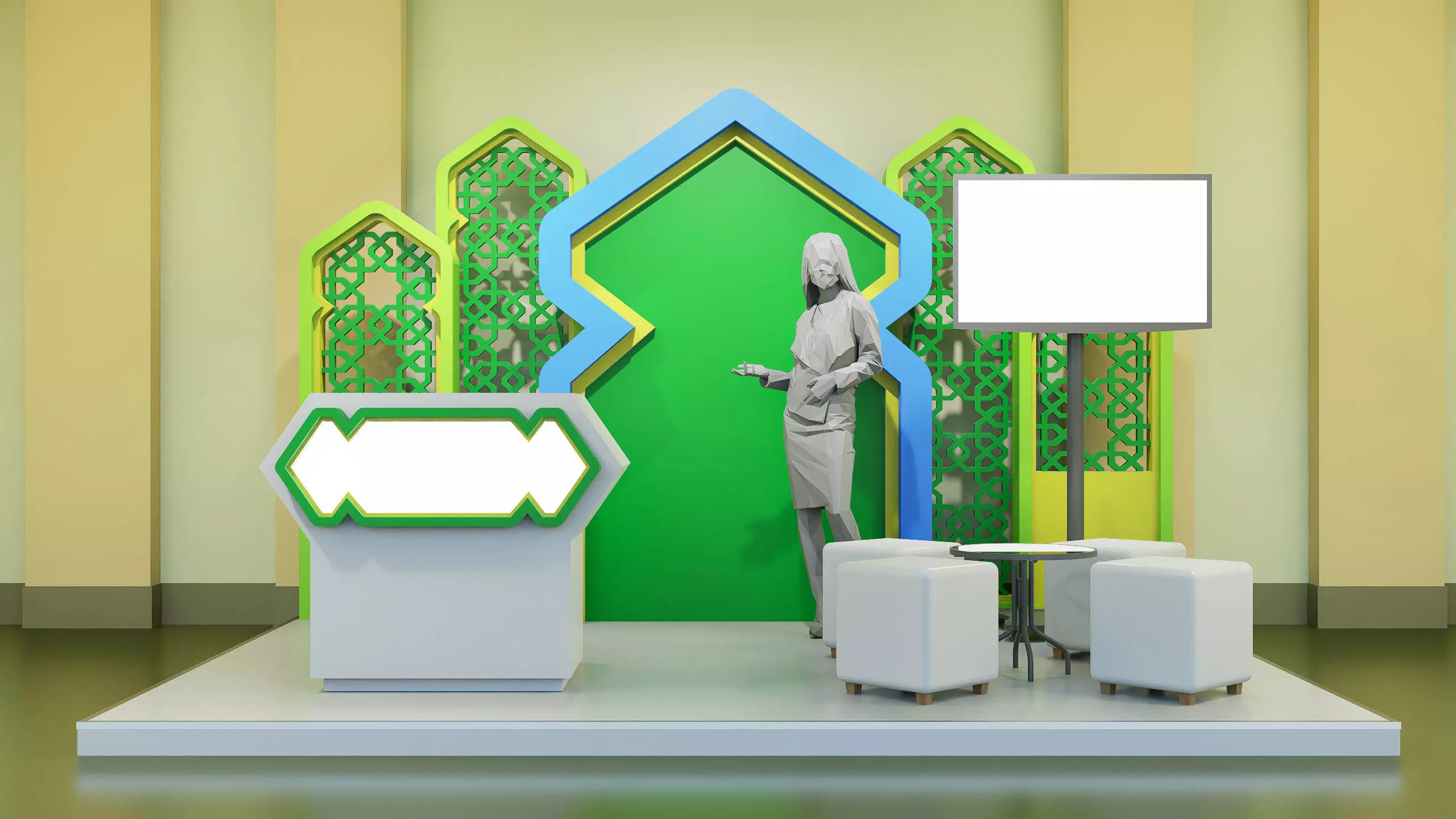 Features • Islamic geometric decorative panels• LED display screen stand• Reception / console counter• Seating area with stools and meeting table• Raised exhibition flooring platform• Clean and optimized geometry