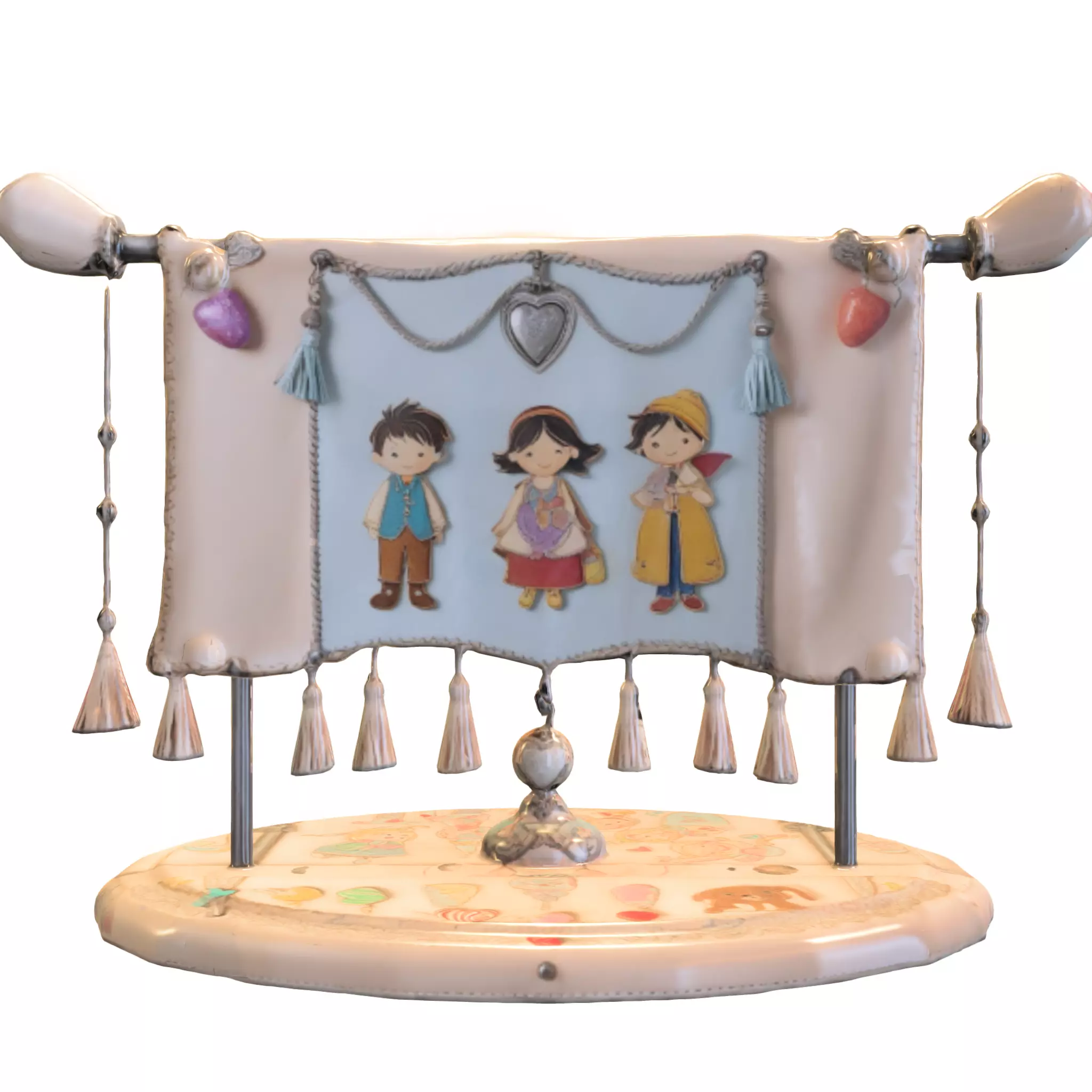 The Fairy Tale Storybook Banner is a charming 3D asset inspired by children's tales and whimsical storytelling. Featuring three illustrated characters in classic storybook style, this prop is adorned with delicate tassels, heart-shaped accents, and soft pastel details on a decorative stand. It's perfect for adding warmth, innocence, or a fantasy theme to any game environment.