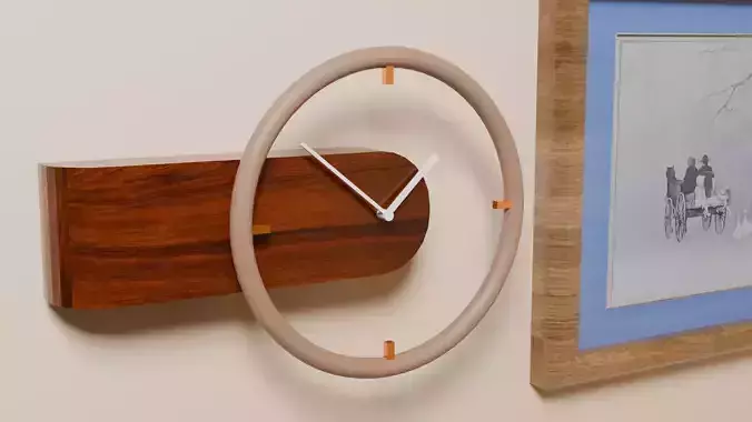 This modern wall clock features a distinctive sculptural design with a wooden base and a seemingly floating circular ring. The hour markings are positioned on the ring, while the clock hands extend from the center, pointing outward toward the corresponding hour indicators. The contrast between the solid wooden base and the open, airy ring creates a striking visual effect, giving the impression that the timepiece is suspended in mid-air. Crafted with clean lines and smooth surfaces, the clock emphasizes minimalist elegance while remaining functional and easy to read. Its unique floating-ring design adds depth and dimension to any wall, making it an ideal centerpiece for living rooms, offices, or creative spaces. Combining natural wood textures with a contemporary geometric form, this clock blends modern artistry with practical timekeeping. Perfect for enthusiasts of innovative design or those looking for a statement décor piece, it transforms a simple wall into a gallery-like display.