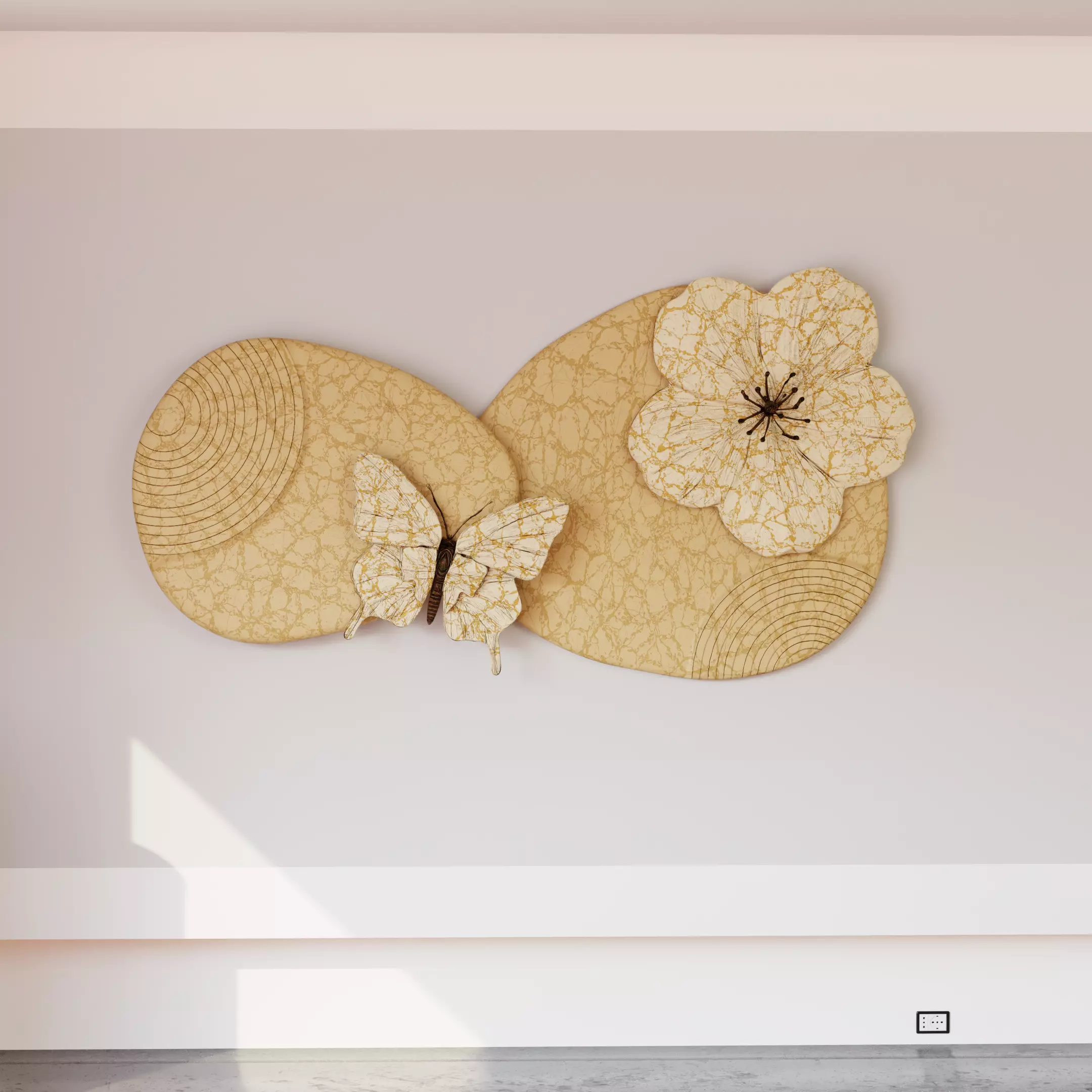 The mural consists of overlapping rounded panels that act as a visual base, subtly textured with fine surface patterns and gentle tonal variations. These panels provide depth and structure without distracting from the main decorative elements. On top of this base, a stylized flower and butterfly are integrated as raised sculptural components, adding dimensional contrast and focal interest.
