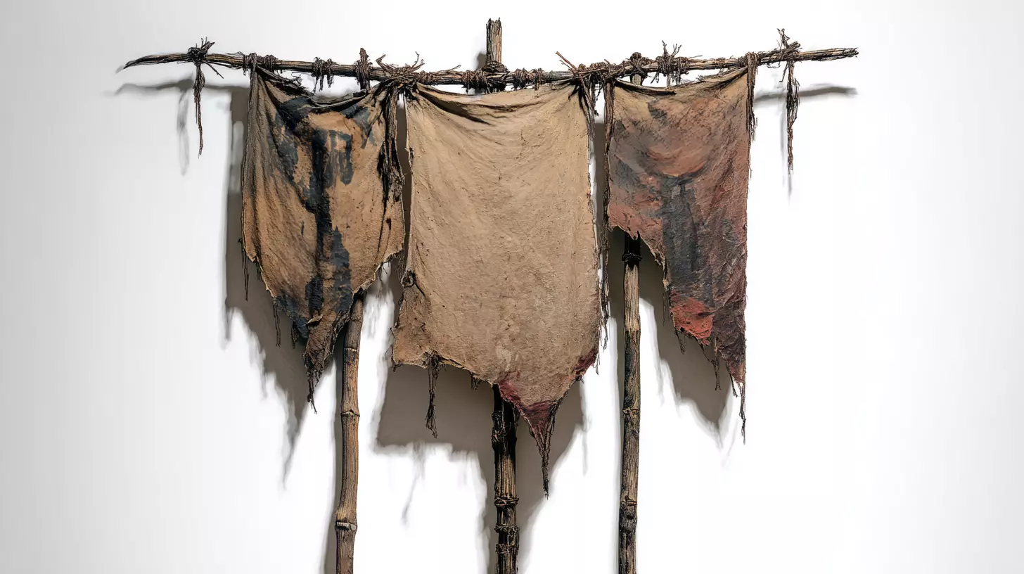 Each tear and stain on the tattered fabric hints at untold battles and sorrow. The fabric itself bears faint marks of soot and blood, preserved through age and decay, while the wooden frame carries the scars of weather and neglect. It feels as though the banner once bore a symbol of power, now erased by centuries of rain, wind, and silence. What remains is not just a decoration — it’s a monument to endurance, a physical echo of loss, memory, and survival.