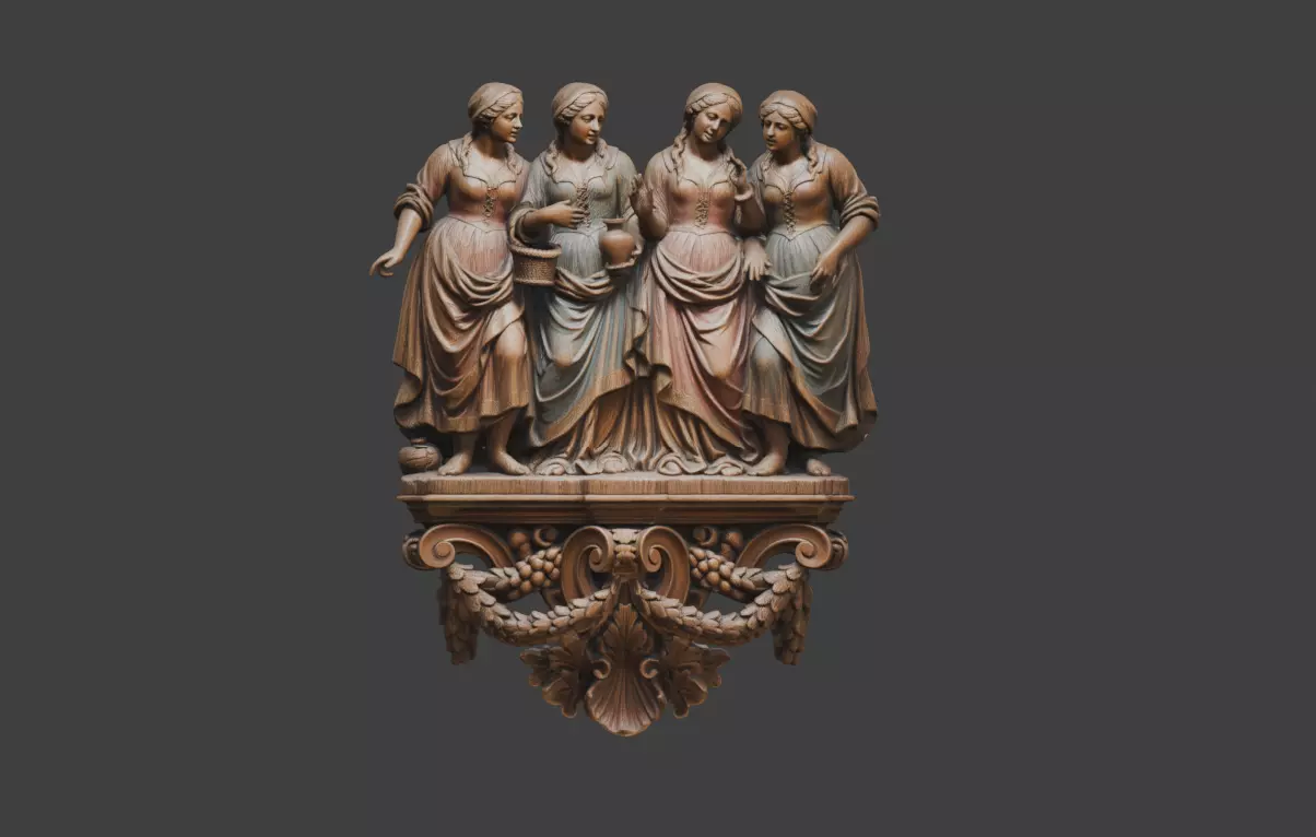 Four Maidens Wooden Relief is a highly detailed classical-style 3D sculpture designed as an ornate decorative wall piece inspired by Renaissance and Baroque craftsmanship. This asset captures the elegance of carved wood relief art, portraying four graceful maidens standing together in a harmonious composition above an intricately ornamented base.