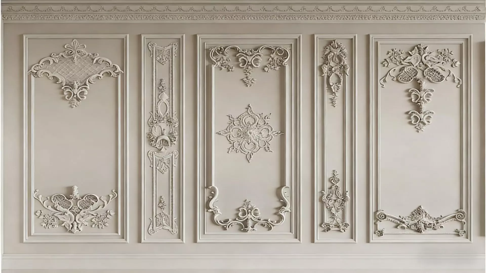 This is a French light luxury style wall panel accent wall brimming with a romantic ambiance, featuring a soft creamy off-white as the dominant hue. The wall is assembled from multiple groups of symmetrically shaped wall panels, inlaid with elaborate and intricate European-style gypsum carvings that incorporate motifs such as scrollwork, floral patterns and diamond lattice designs, boasting elegant and delicate lines with rich layers.The overall design blends the opulence of a vintage palace with the soft texture of a modern cream style. Ideal as an accent wall for living rooms and bedrooms, it also creates an elegant and sophisticated visual focal point for the space, serving as the finishing touch for interior design styles such as French, European and light luxury.