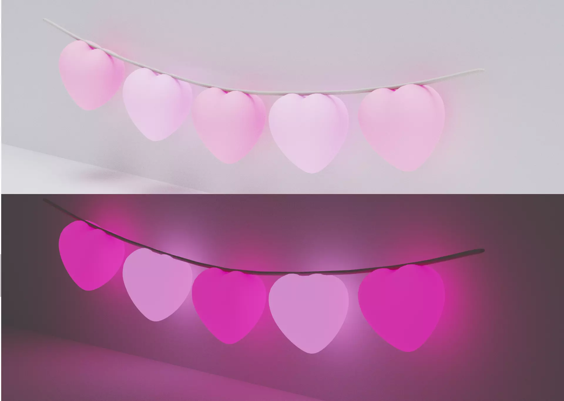 A stylized 3D heart garland featuring five heart-shaped lights glowing alternately in soft pink and rose tones. Perfect for romantic, cozy, or playful scenes. This cute decorative prop is ideal for Valentine's Day renders, children's rooms, or UI/game design. Comes with PBR textures for a polished and appealing look in both real-time and pre-rendered projects.