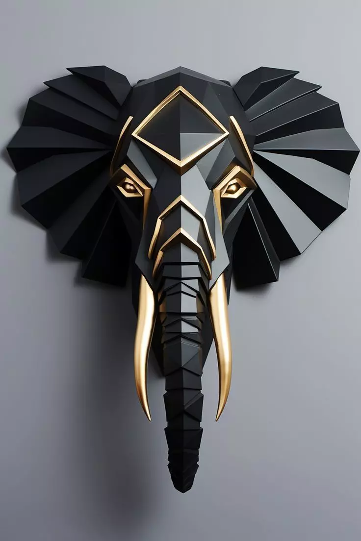 Search terms: geometric elephant head 3d, black gold wall art, faceted sculpture, high end decor render, editorial luxury 3d, cinematic jewelry, premium 3d asset, fine jewelry design, symbol of wisdom sculpture, luxury brand content, digital fashion, tech product shot, animal motif jewelry, elegant sculpture 3d, sculptural elephant, majestic accessory, powerful jewelry, mythical beast, untamed luxury, regal elegance.
