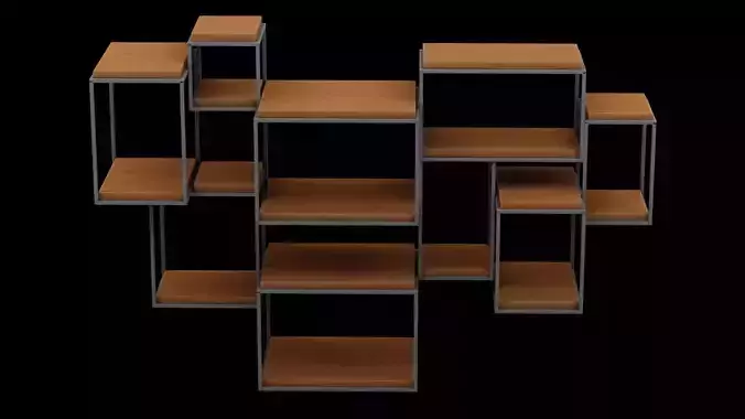 A bold, wall-mounted shelving unit designed with overlapping rectangular elements, forming a striking geometric pattern. The asymmetrical arrangement creates a visually dynamic storage solution while maintaining balance and functionality. Perfect for organizing essentials in modern and industrial-style spaces. Available in BLEND, FBX, and OBJ formats for versatile use.