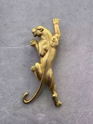 The design emphasizes sleek, streamlined forms characteristic of the Art Deco style, with smooth contours, exaggerated musculature, and bold proportions that convey strength and elegance. The panther’s head is turned slightly to the side, mouth open in a silent roar, adding drama and expression to the piece. Fine details such as claws, facial features, and subtle texturing on the fur enhance its realism while maintaining an artistic abstraction.