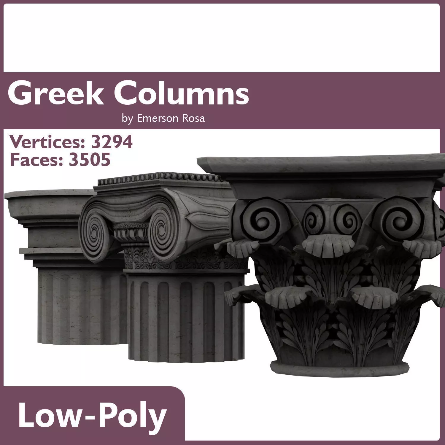 A low-poly version of the three greek columns: Doric, Ionic and Corinthian!