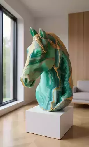 Description (4000 characters):Ultra-realistic 3D model of a green agate horse sculpture, designed as a surreal fusion of natural geology and animal form. The piece features the head and neck of a horse carved from polished agate—featuring swirling bands of emerald green, teal, and white—that create a mesmerizing, organic pattern. The surface is smooth and glossy, reflecting light beautifully to enhance its depth and translucency.